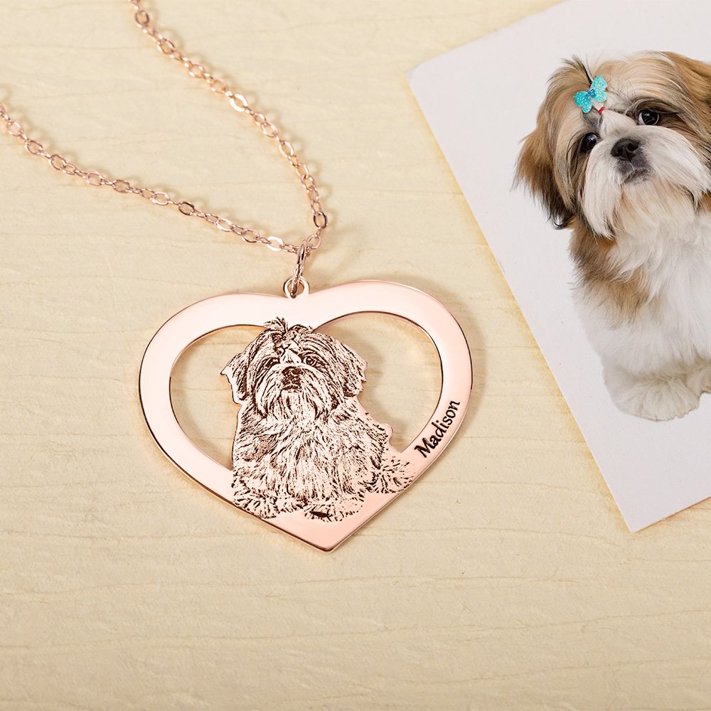 Este collar con corazón de mascota es un recuerdo único diseñado para los amantes de las mascotas. Puede subir una foto de su mascota, y nosotros utilizaremos tecnología de grabado láser para mostrar delicadamente el cuerpo completo de la mascota en el colgante en forma de corazón, como si la mascota estuviera acurrucada en su corazón. Además, el collar permite personalizar el nombre de la mascota.