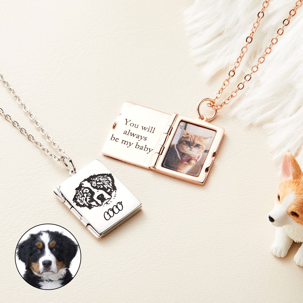 Nuestro collar adopta el diseño de un pequeño libro, añadiendo el elemento "medallón". La capa superficial puede grabarse con el retrato de tu mascota a partir de una foto que subas y un nombre. Al abrirlo, verás una cita que puedes personalizar y otra foto que subas. Se trata de un collar memorable que te ayudará a registrar cada ocasión preciosa que merezca la pena guardar.