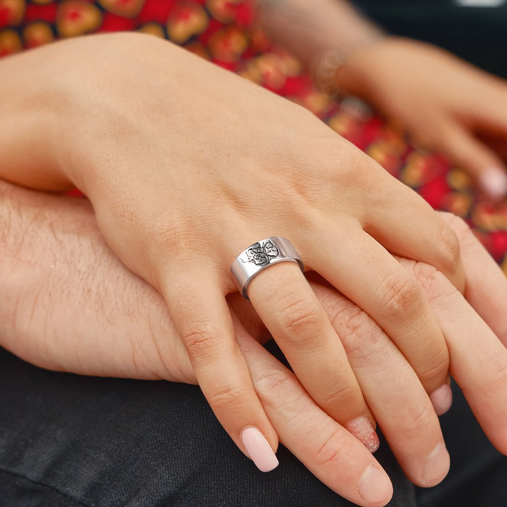 Este anillo personalizado con foto está diseñado para atesorar un bello momento. Puede elegir una foto suya con su pareja o su familia, y nosotros la grabaremos en el anillo para que cada detalle cobre vida. También puede personalizar el texto del anillo. Cada vez que lo lleve, sentirá el calor y los recuerdos, como si estuviera estrechamente unido a su ser querido o a su familia.