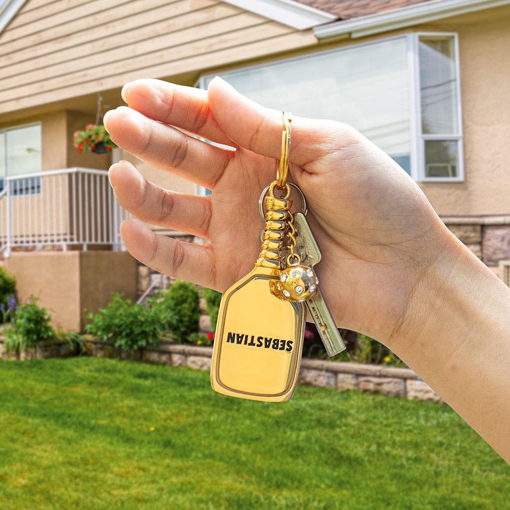 Este llavero único está elaborado con la forma de una raqueta de pickleball clásica, con un impresionante colgante de pickleball, adornado con brillantes circonitas cúbicas, lo que lo convierte en un accesorio perfecto para sus llaves o bolso. Puede ser personalizado con el nombre del destinatario, iniciales, o cualquier otro texto deseado, por lo que es un regalo reflexivo y práctico para cualquier entusiasta de pickleball en su vida.