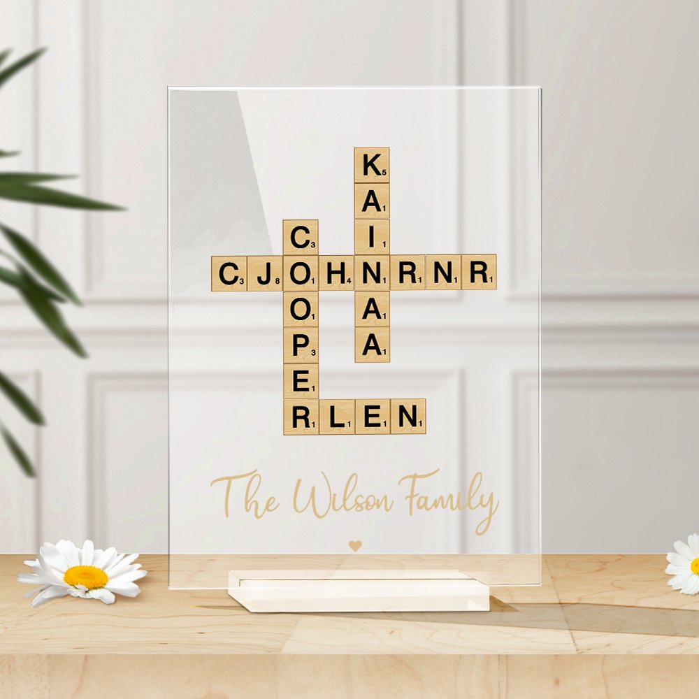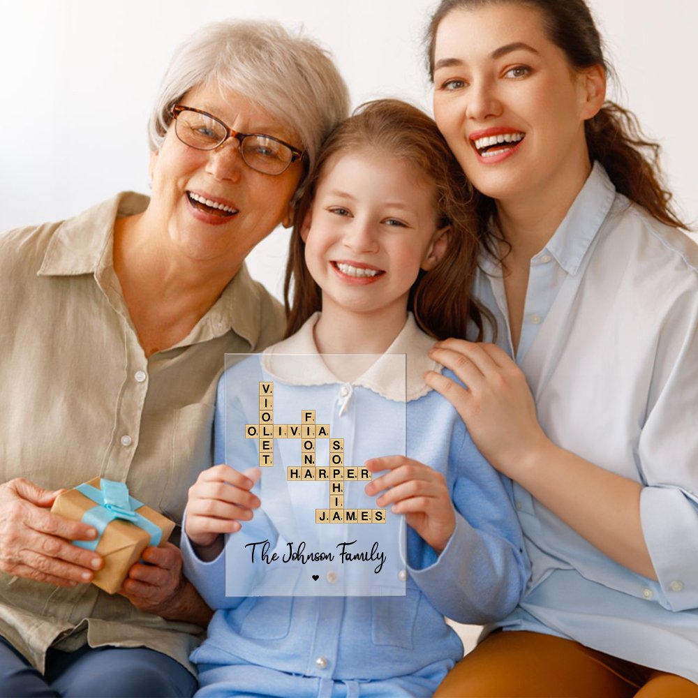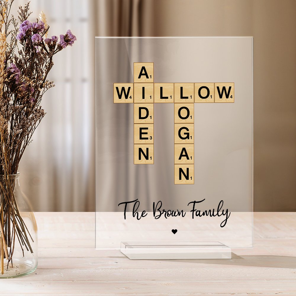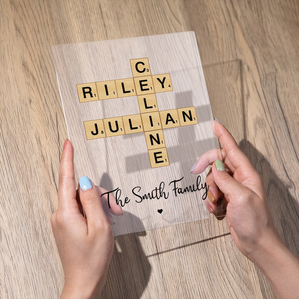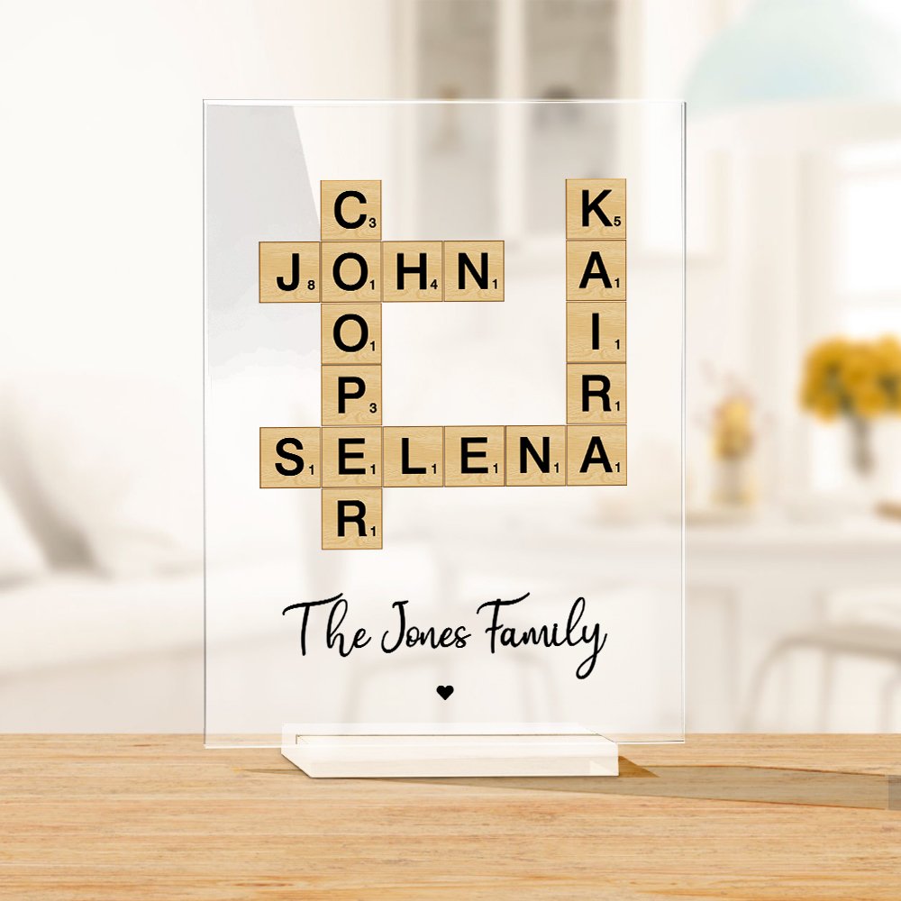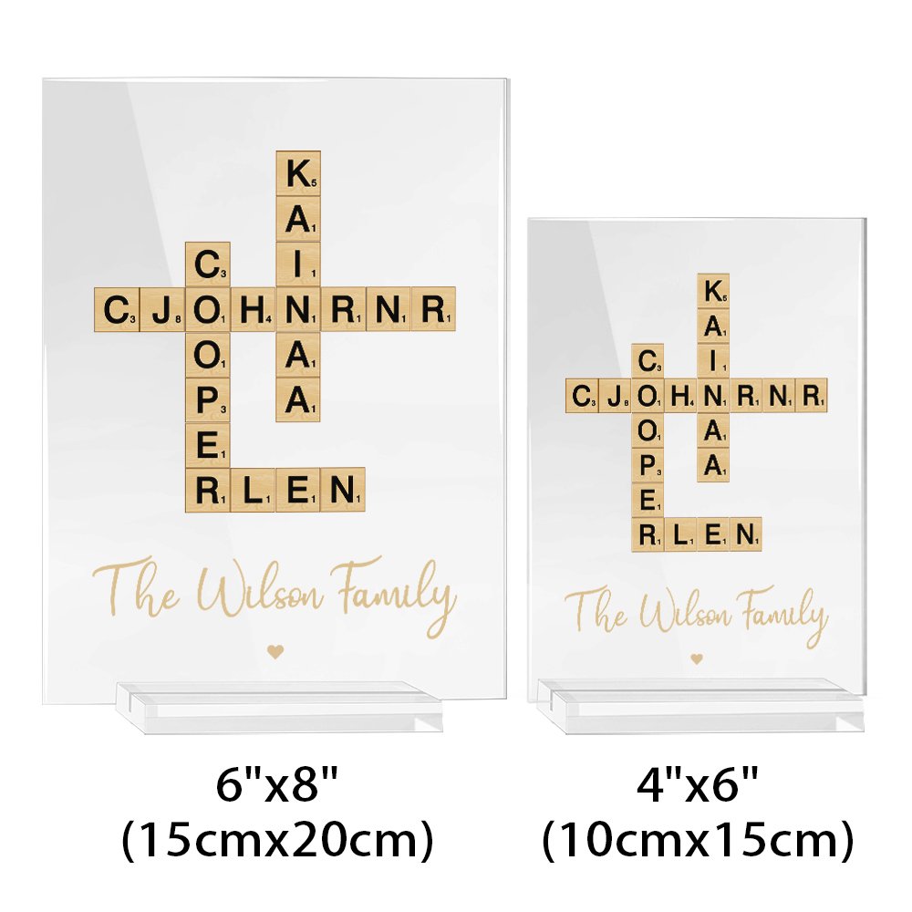 Celebra el vínculo único de tu familia con esta placa acrílica de diseño creativo con los nombres de tu familia en un divertido formato de crucigrama. Personalizable con 2-25 nombres de miembros de la familia, es una pieza de arte memorable que muestra maravillosamente la individualidad y la unión de su familia, por lo que es el regalo perfecto para cualquier ocasión.