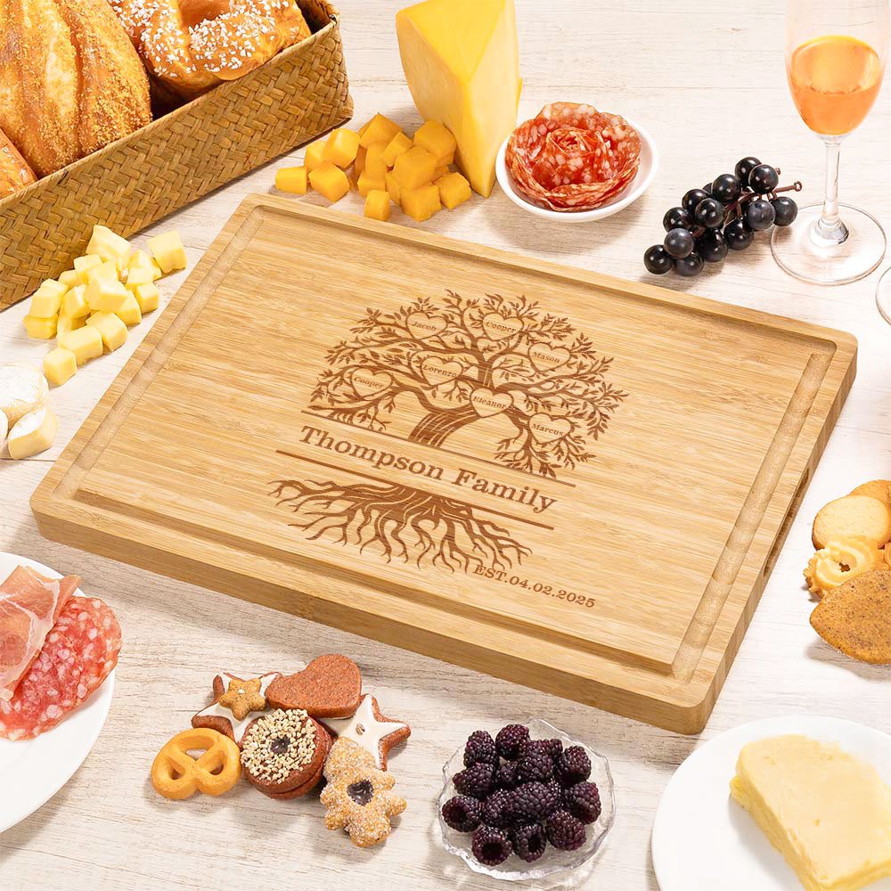 Inspirado en el árbol de la vida, sus intrincadas raíces simbolizan que el amor hace que los niños prosperen y que el amor hace que las familias perduren y se unan. Los nombres personalizados de 2 a 20 se integran en el diseño y se transforman en fructificaciones. También puede personalizar el nombre de la familia y la fecha para crear un accesorio de cocina único.