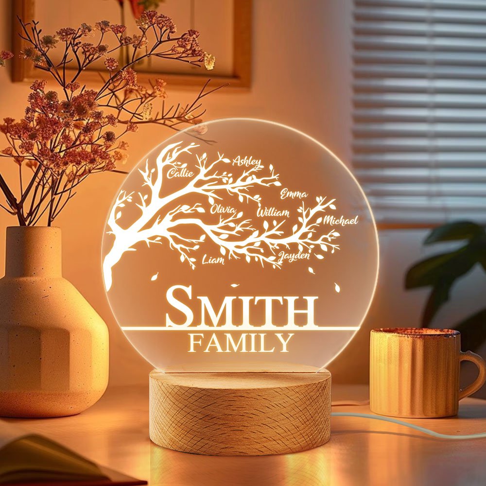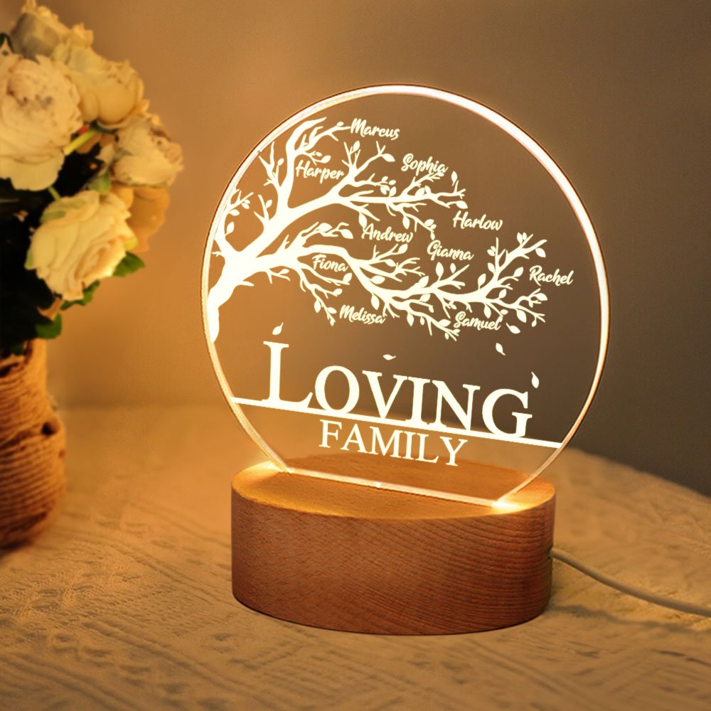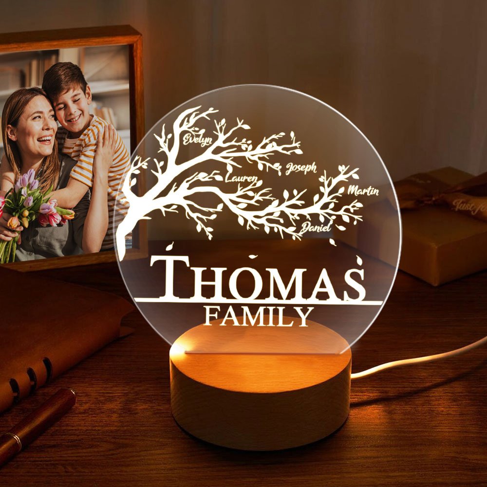 Este adorno de luz nocturna acrílica de árbol genealógico está diseñado con un estilo moderno y sencillo. Incorpora cálidas emociones familiares en la lámpara de acrílico transparente. Los nombres de los miembros de la familia se ven tenuemente entre las ramas y las hojas, y el nombre de la familia y el texto se pueden personalizar, lo que permite que el amor brille cálidamente por la noche.