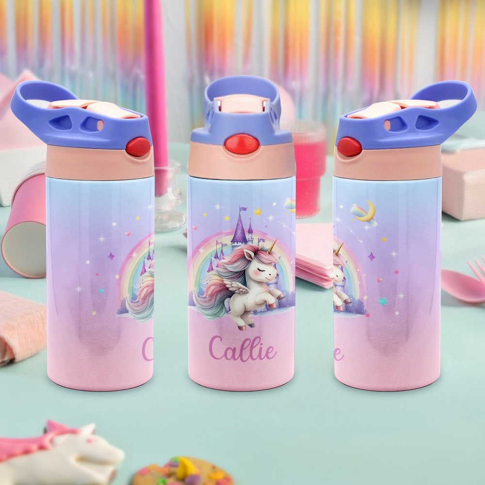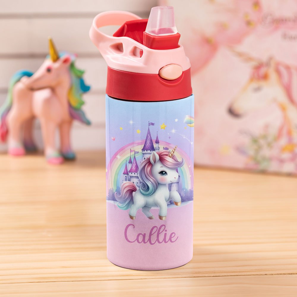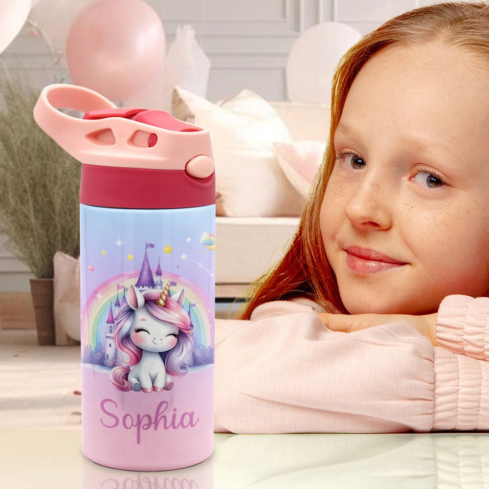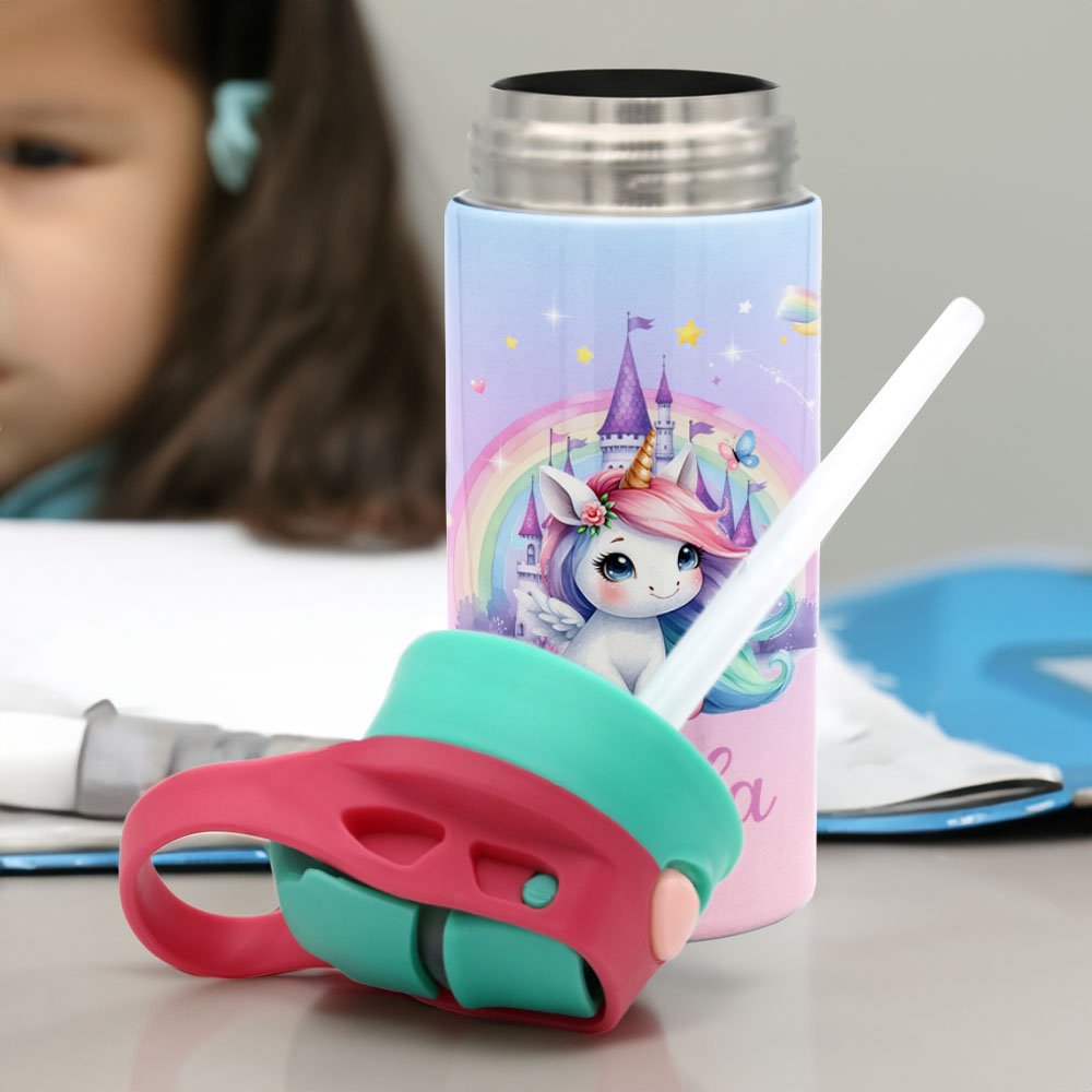 Encante a su hijo con esta botella de agua de ensueño con aislamiento de unicornio. Presenta un mágico diseño de unicornio con castillos, arco iris, estrellas y mucho más que cautivará los corazones de niños y niñas. Sus brillantes colores y caprichosos dibujos convertirán la hidratación diaria en toda una aventura. Además, puedes personalizarla con el nombre de tu hijo para convertirla en un tesoro especial que atesorará.