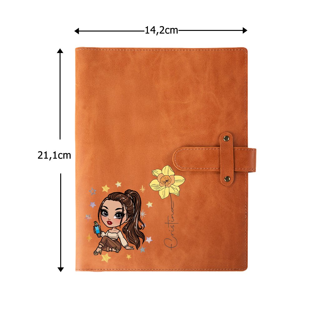 Esta funda de cuero para cuaderno de bocetos destaca por su diseño único. Cada pieza de cuero está decorada con un dibujo personalizado de una chica de cómic, permitiéndote elegir una que se identifique con tu personalidad o que se asemeje al destinatario, lo que la convierte en un accesorio exclusivo. Además, puedes personalizarla añadiendo tu nombre y las flores de nacimiento, dándole un toque personal y especial a tu cuaderno de bocetos.