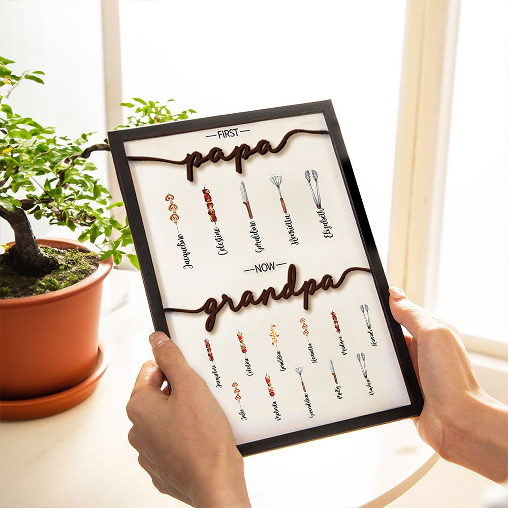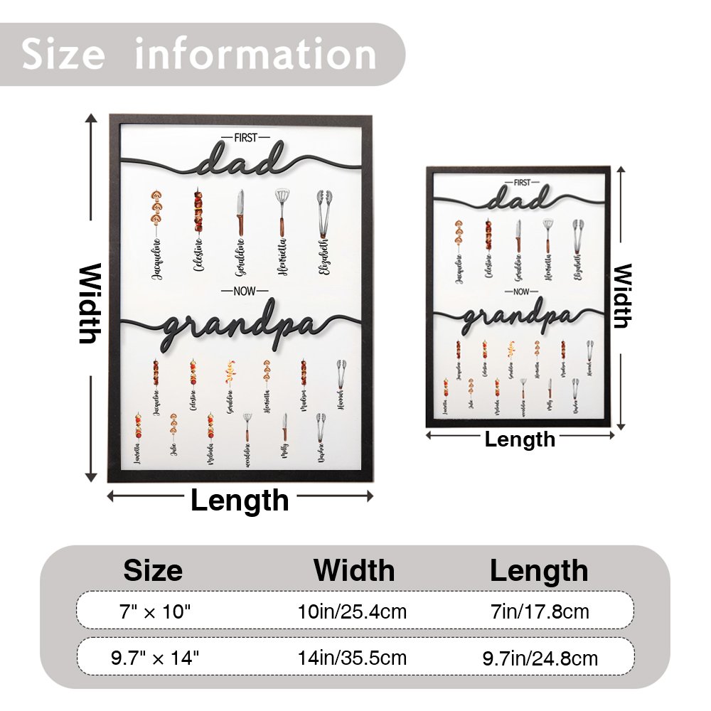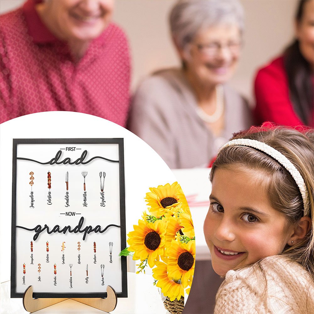 Nuestro primer papá ahora abuelo BBQ marco de madera utilizar patrones de barbacoa para representar a cada miembro de la familia en el hogar, añadir un ambiente lúdico. El texto "primero papá ahora abuelo" muestra un sentido homenaje al vínculo especial entre el abuelo y sus pequeños.