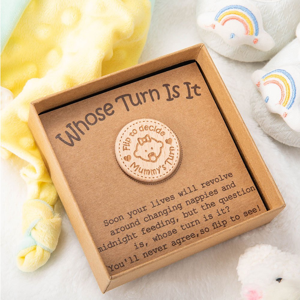 El texto debajo de la moneda, que dice "Dale la vuelta para decidir quién hace la tarea, papá o mamá", añade un elemento interactivo y divertido. "Pronto vuestras vidas girarán en torno a cambiar pañales y dar de comer a medianoche, pero la pregunta es: ¿a quién le toca? Nunca os pondréis de acuerdo, ¡así que voltea para ver!". - Esta línea juguetona añade un toque humorístico a la tarjeta, haciéndola a la vez encantadora y entretenida.