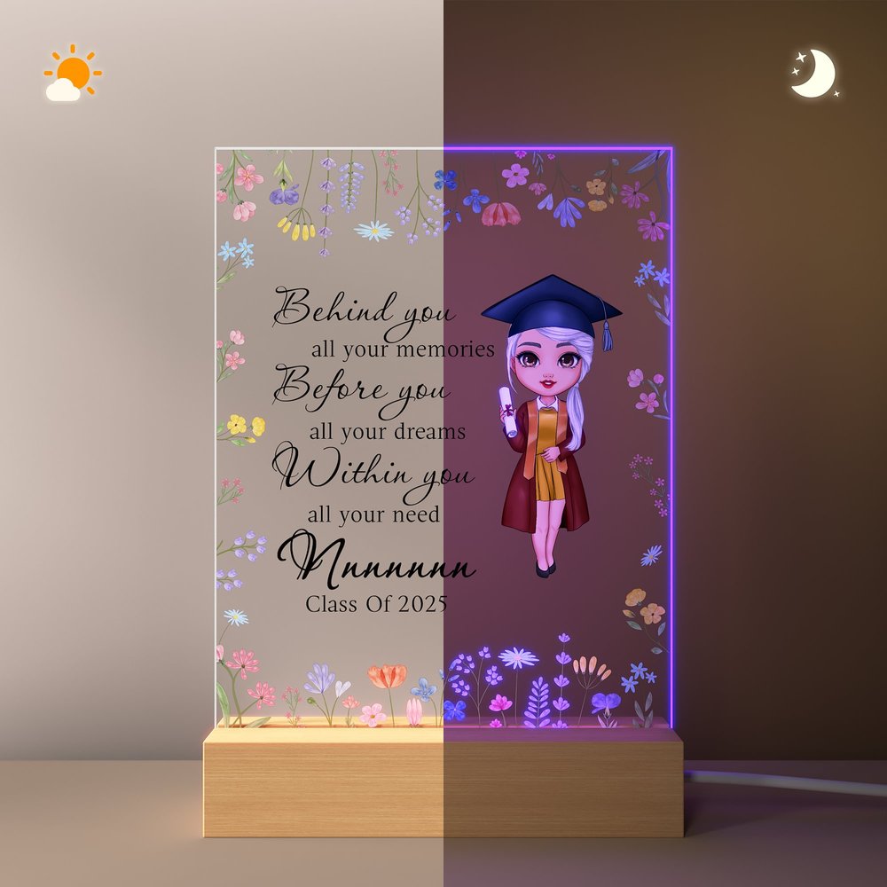 Esta luz nocturna utiliza un simpático estilo de dibujos animados como elemento visual principal, con suaves adornos florales, que muestran un ambiente juvenil de graduación. El diseño único incorpora frases de apoyo inspiradoras como "Detrás de ti, todos tus recuerdos" y "Delante de ti, todos tus sueños". No es sólo una luz nocturna, sino también una hermosa bendición y compañía. Admite añadir nombres para crear un recuerdo único exclusivo para ella.