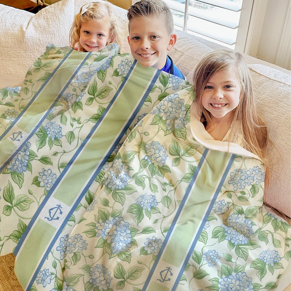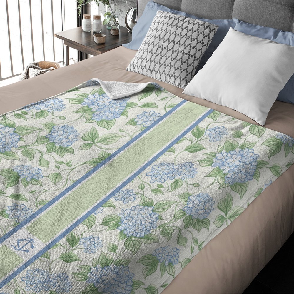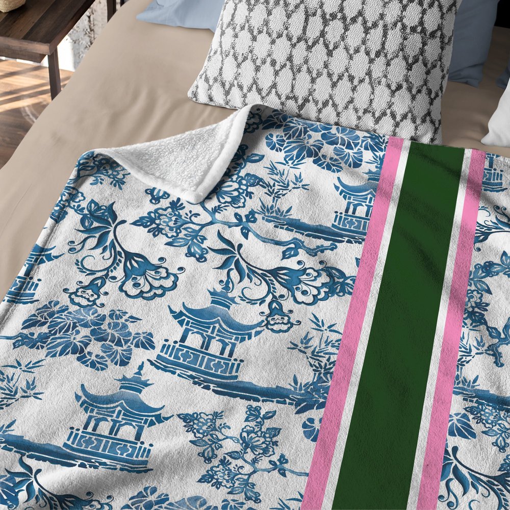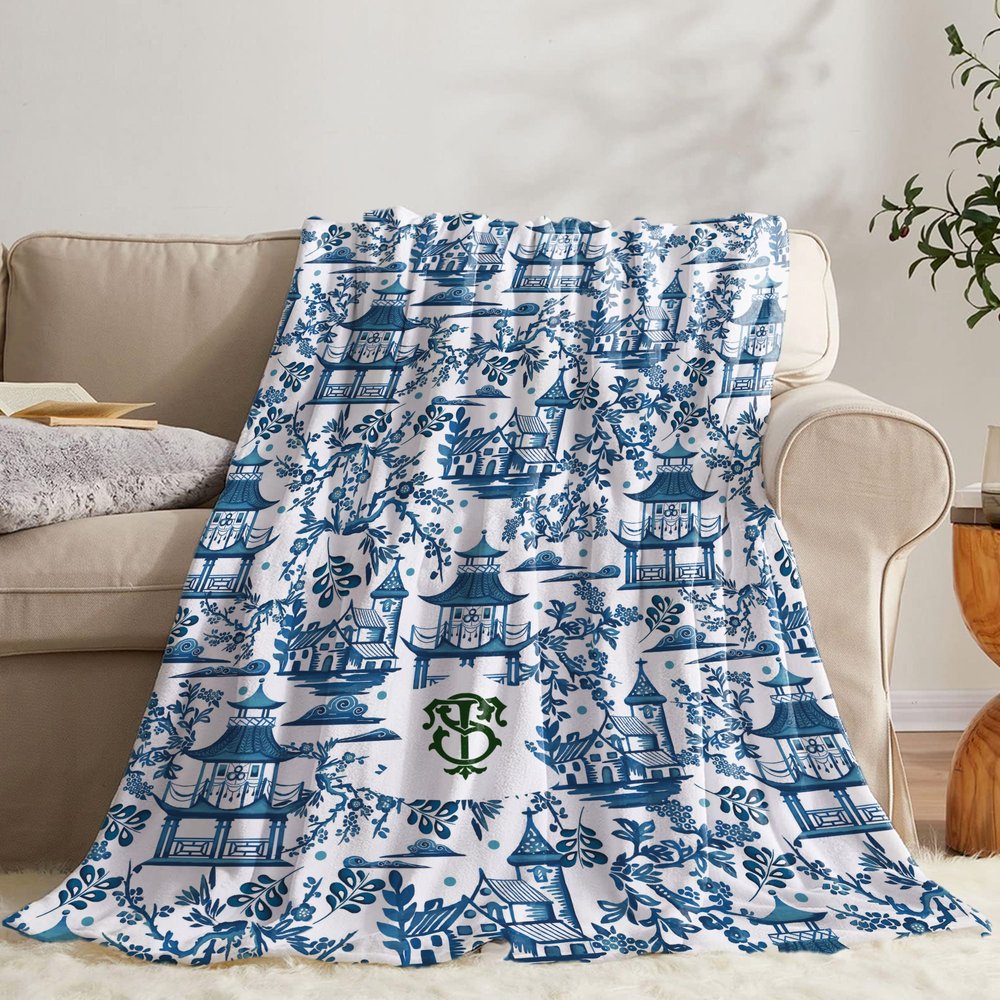 Esta manta presenta un diseño inspirado en la Chinoiserie, con una variedad de exquisitos motivos florales y arquitectónicos, entrelazados con ricos colores como el azul, el verde y el rosa, que muestran un refinado encanto oriental. Todos los modelos incluyen también monogramas personalizados, lo que confiere a la manta una estética clásica y exclusiva a la vez, infundiendo a cualquier espacio un toque oriental único.
