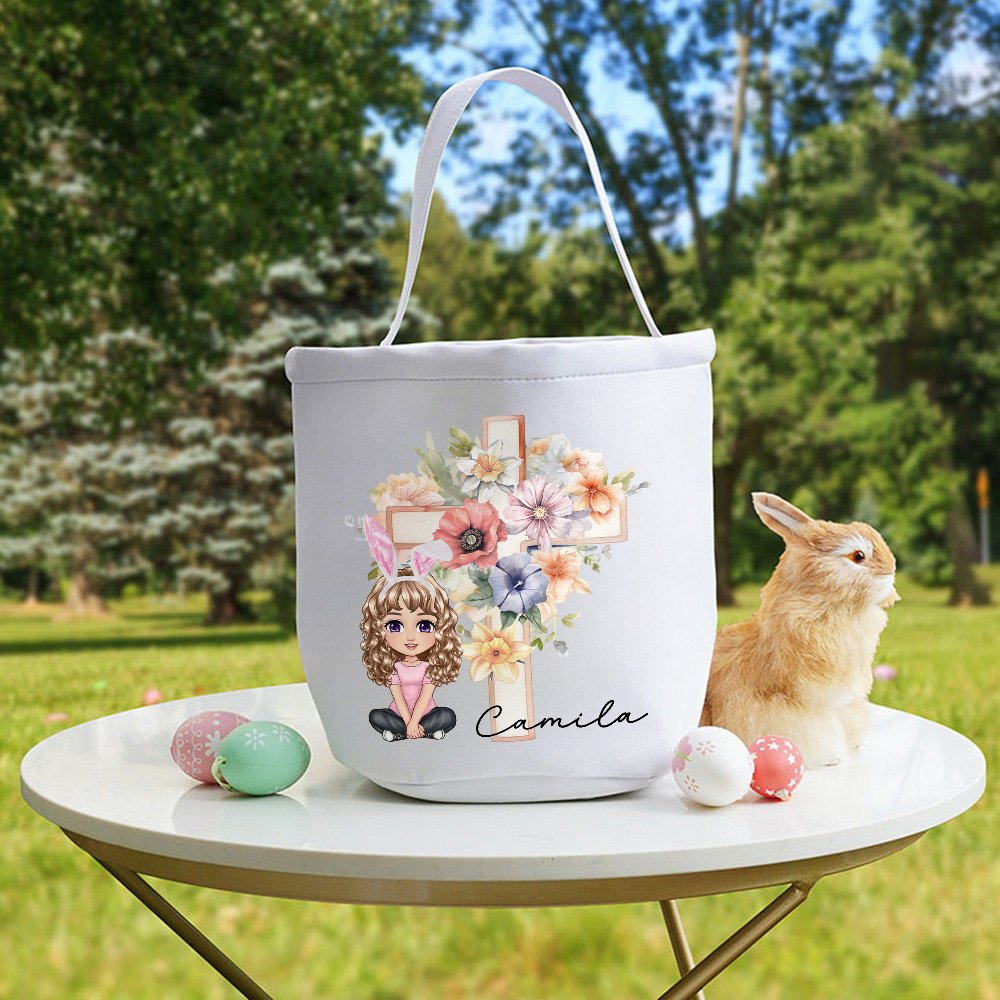 Esta bolsa cubo combina simpáticos elementos de dibujos animados de orejas de conejo con un bonito diseño floral cruzado, lo que aporta a la tradición de Pascua más diversión y calidez. Puede personalizar 1-5 flores de cumpleaños y el nombre de su hijo para hacer de esta cesta un recuerdo único.