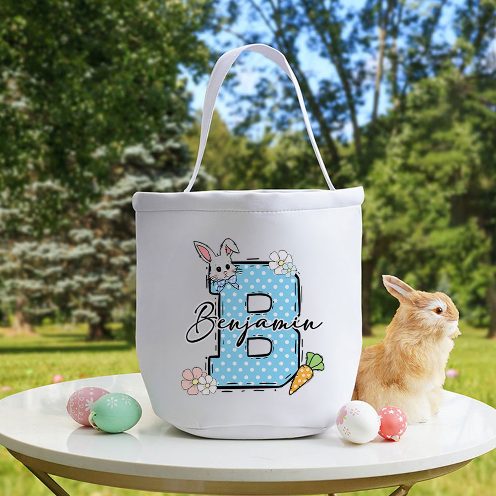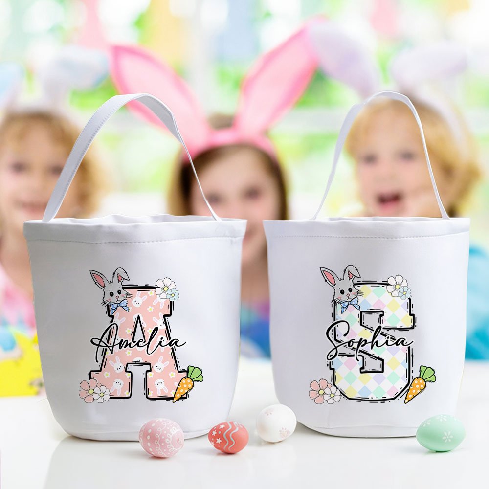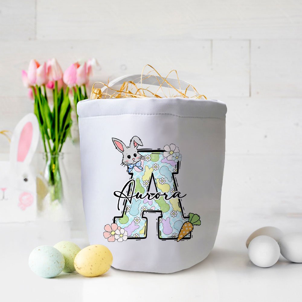 El diseño de la cesta está lleno de alegría festiva. La cesta tiene una base de color blanco puro con un alegre y simpático estampado de conejo de Pascua y flores de colores alrededor, y la bolsa también se puede personalizar con las iniciales y el nombre del niño. Este diseño no sólo añade diversión a la Pascua, sino que también hace que cada cesta sea única.