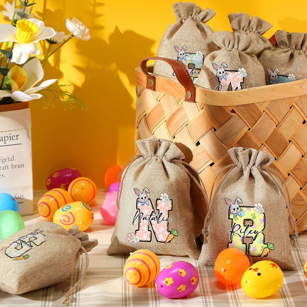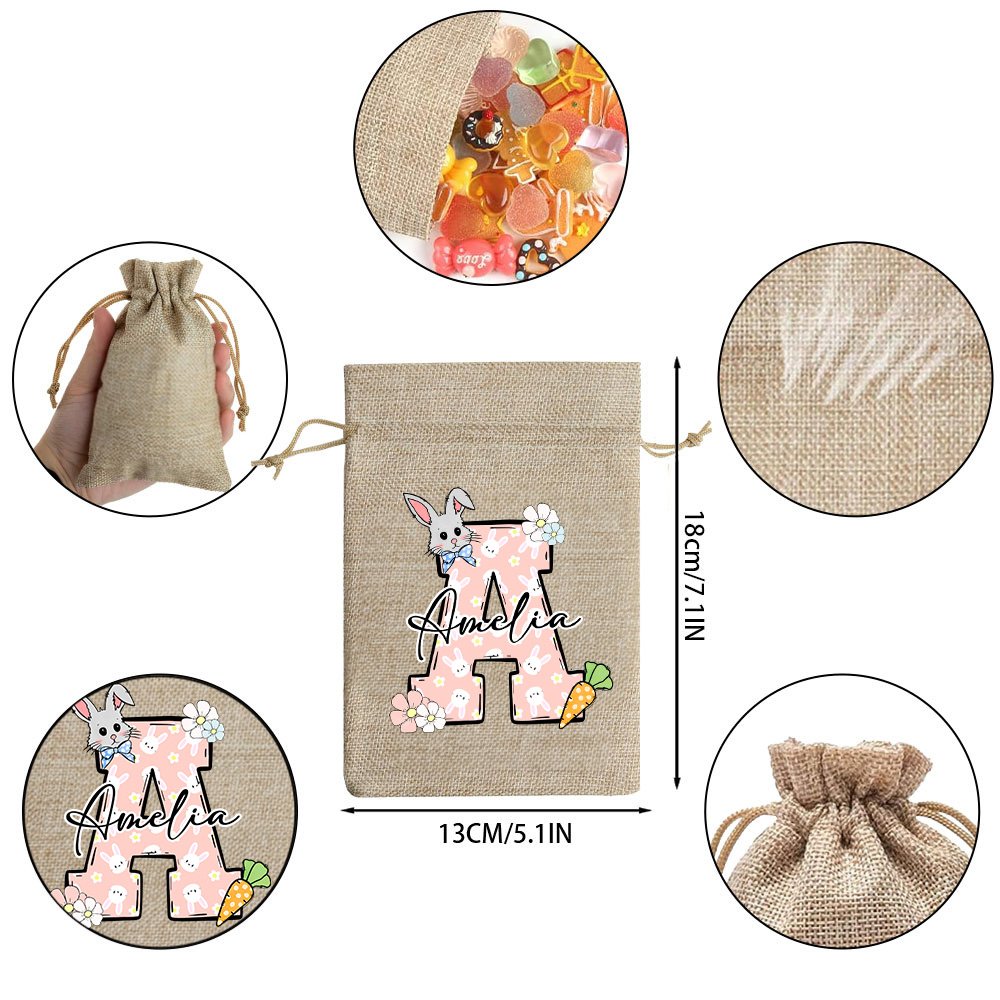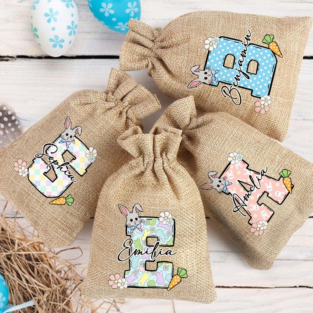 Este saco se puede personalizar con una inicial, cada inicial tiene un alegre y adorable dibujo de conejito de Pascua, rodeado de flores de colores, lo que contribuye al alegre ambiente de Pascua. También puede personalizar los nombres de sus hijos en los sacos para hacerlo aún más exclusivo.