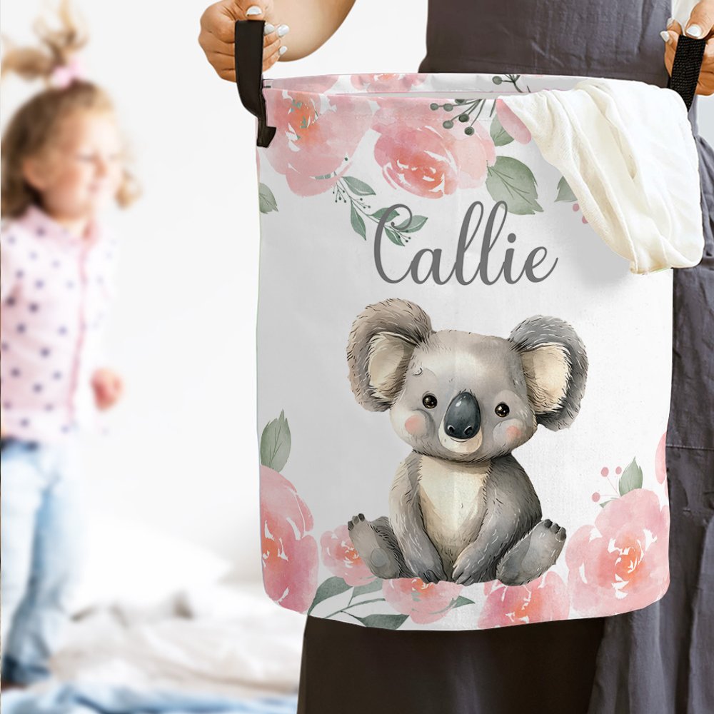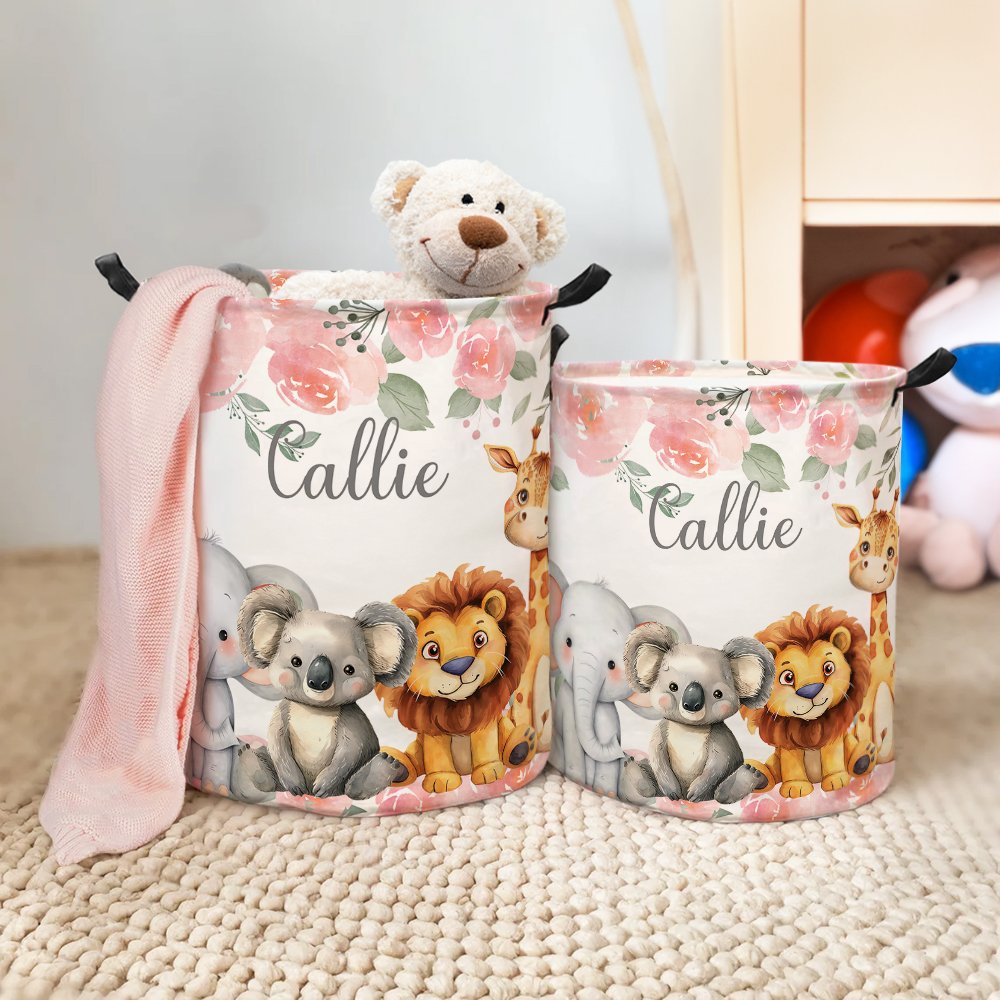 Esta cesta de almacenaje está decorada con simpáticos animales salvajes. El diseño incorpora elementos como elefantes, jirafas, leones, koalas, cebras, monos, hipopótamos, rinocerontes y pandas, con exquisitos motivos florales, llenos de diversión infantil y un ambiente natural. Cada cesta de almacenaje puede personalizarse con un nombre, lo que la convierte en un artículo único y exclusivo.