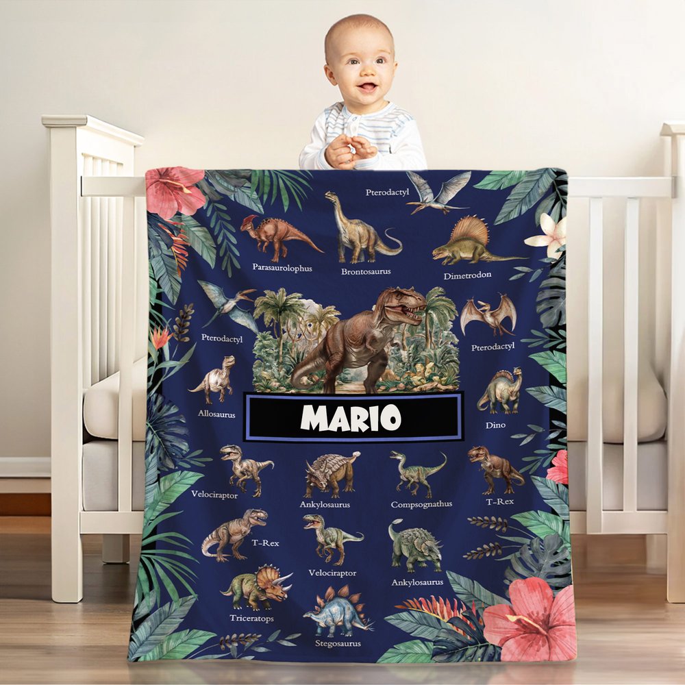 Sumérgete en un mundo prehistórico donde las ilustraciones de dinosaurios se mezclan con selvas tropicales, volcanes y elementos florales. Con 30 motivos de dinosaurios únicos, esta manta combina el atractivo visual con el aprendizaje temprano. Añade un nombre para crear un recuerdo personalizado que despierte la curiosidad y celebre la individualidad de tu hijo.