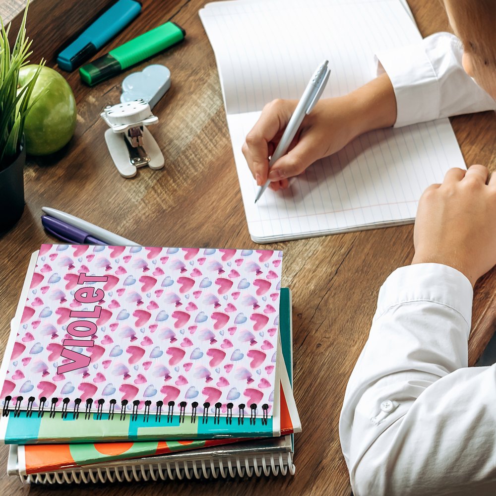 Inspirada en flores, mariposas, corazones y mezclas de acuarelas, la cubierta del cuaderno desprende un toque artístico. Personalizable con su nombre, la combinación de símbolos únicos y bellas imágenes hace de cada cuaderno una expresión única de su individualidad, visualmente atractiva y emocionalmente cálida.