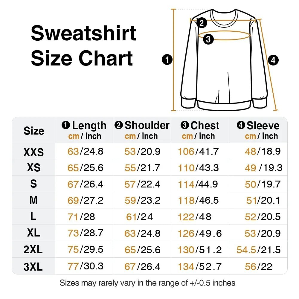 | Medidas: | Camiseta - XXS, XS, S, M, L, XL, 2XL, 3XL, 4XL, 5XL Sudadera - XXS, XS, S, M, L, XL, 2XL , 3XL |