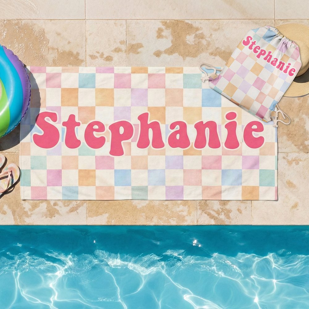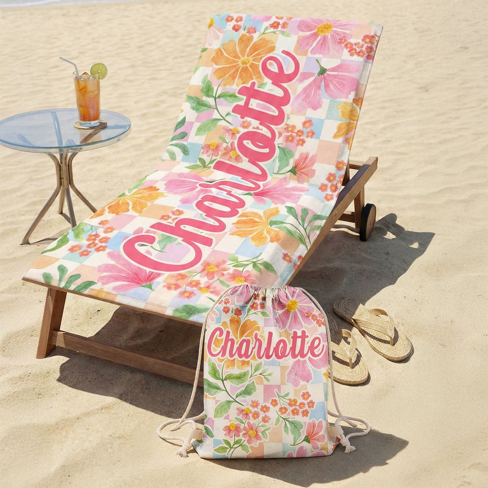 Definida por un vibrante estampado de damero armoniosamente entrelazado con delicados detalles florales, esta toalla de playa ofrece un lienzo para nombres personalizados, transformándola en una pieza única a medida. Combínala con la bolsa con cordón a juego para conseguir un look cohesionado y exclusivo que destaque bajo el sol del verano.