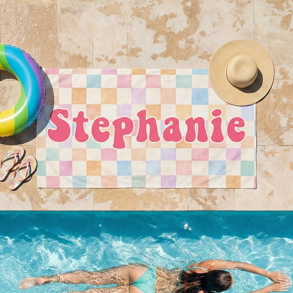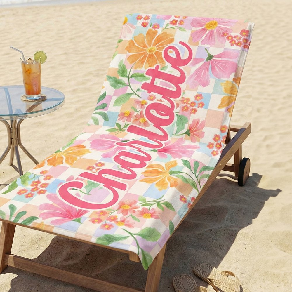 Esta toalla de playa combina ingeniosamente flores vibrantes con un moderno y colorido tablero de ajedrez, dando como resultado un aspecto visualmente atrevido pero armonioso. Un nombre central personalizable convierte esta versátil pieza de moda en una expresión artística personal.