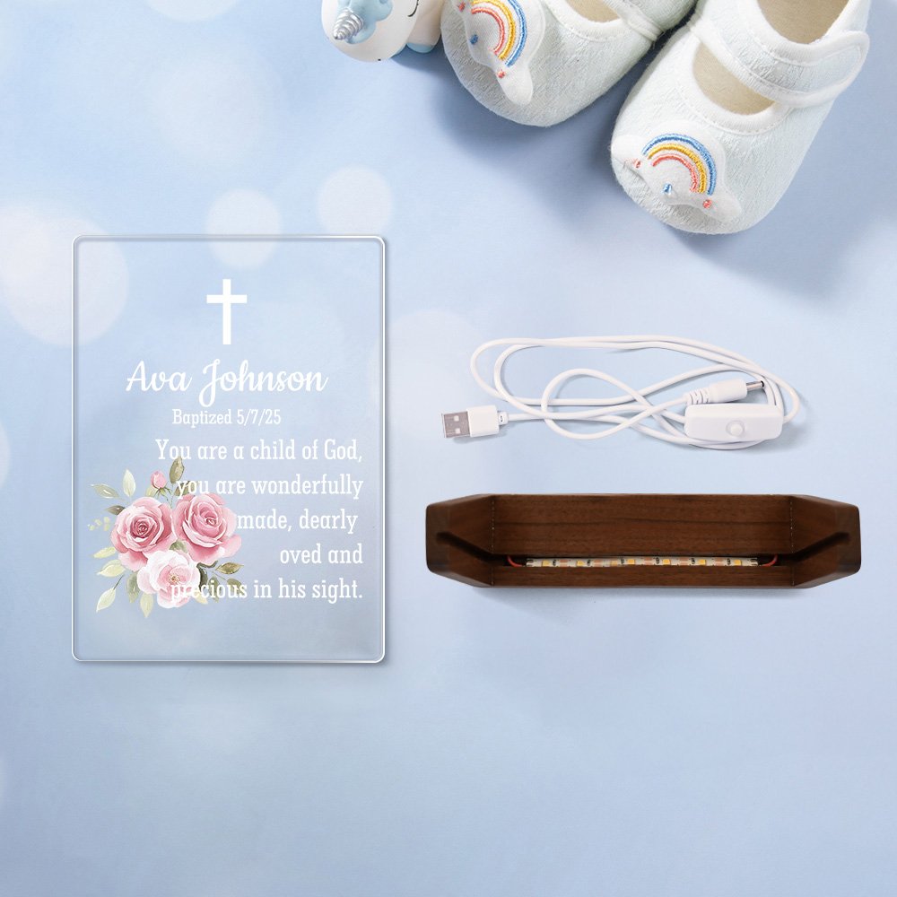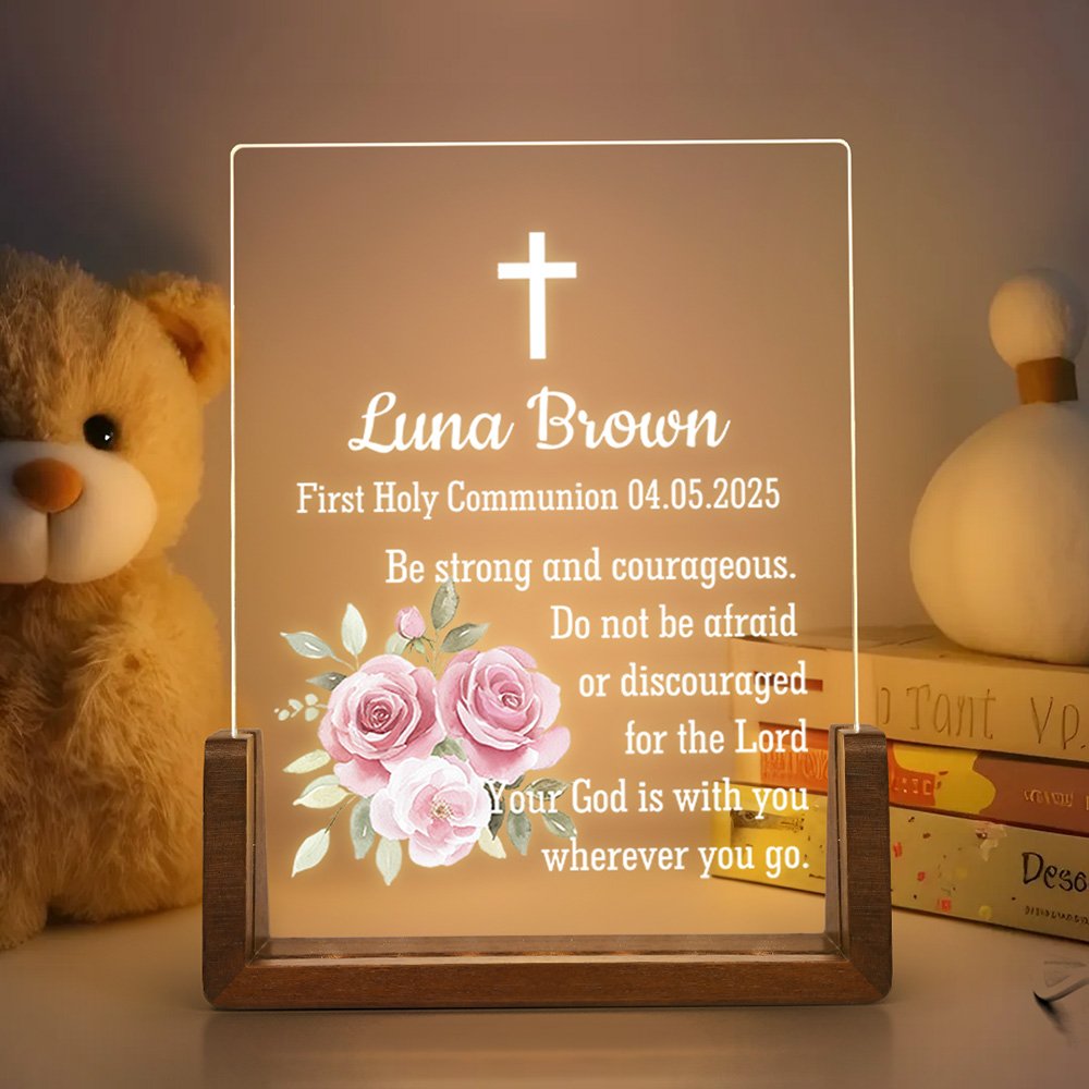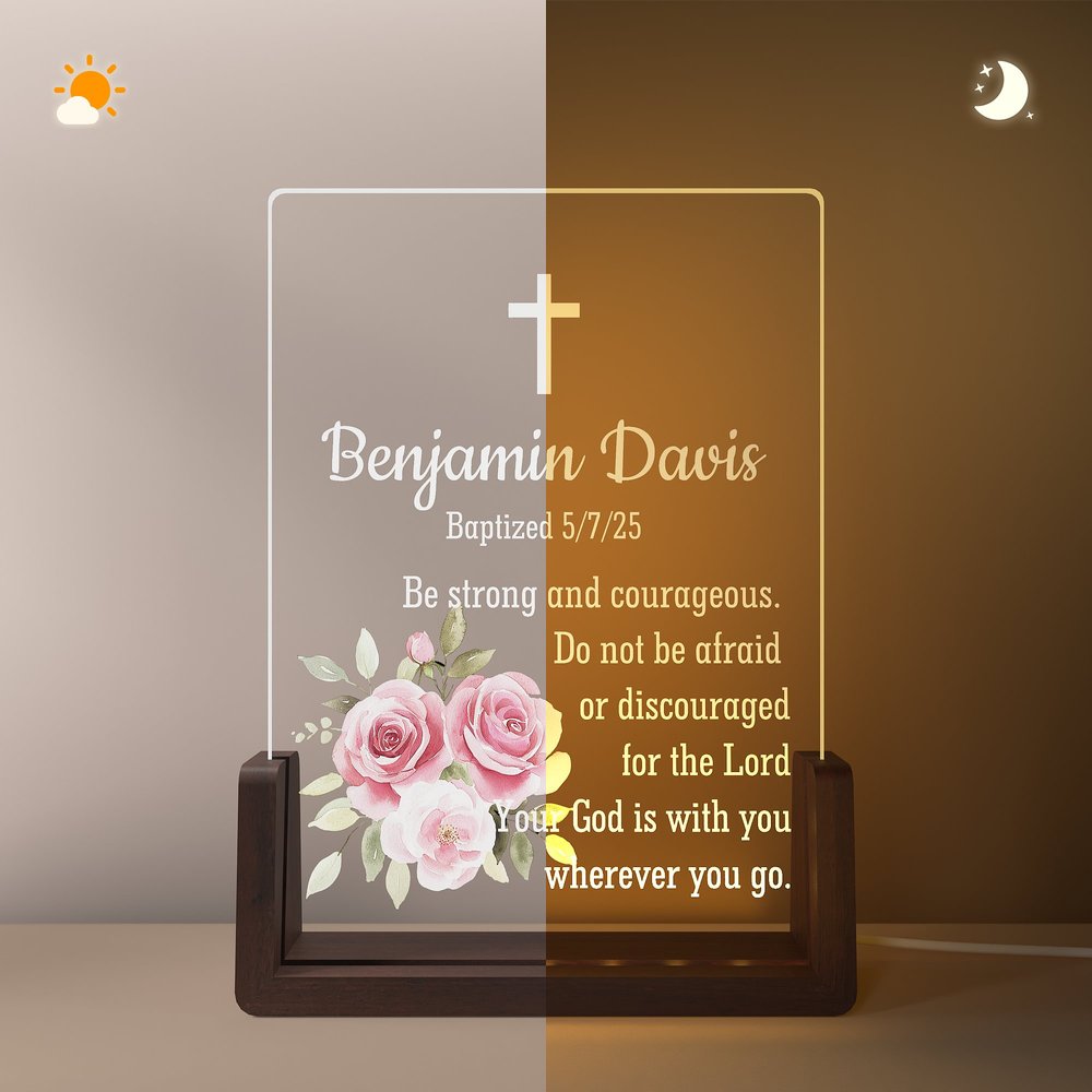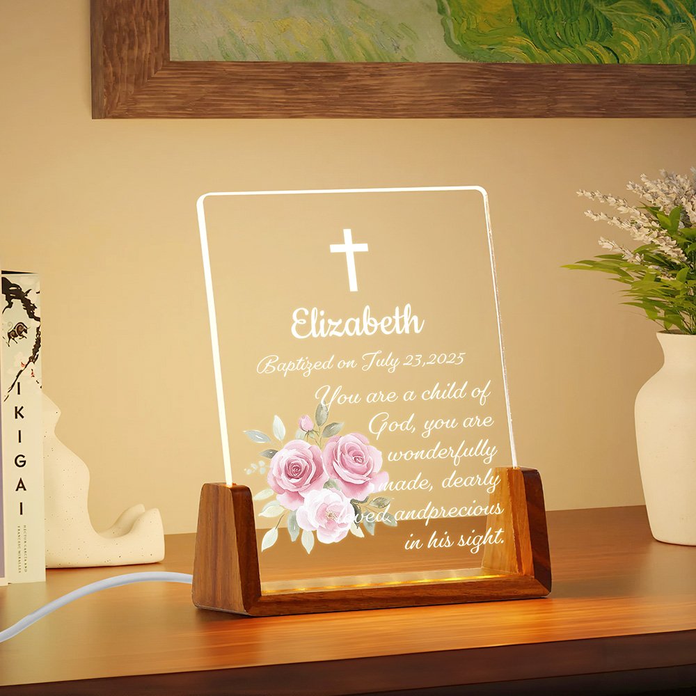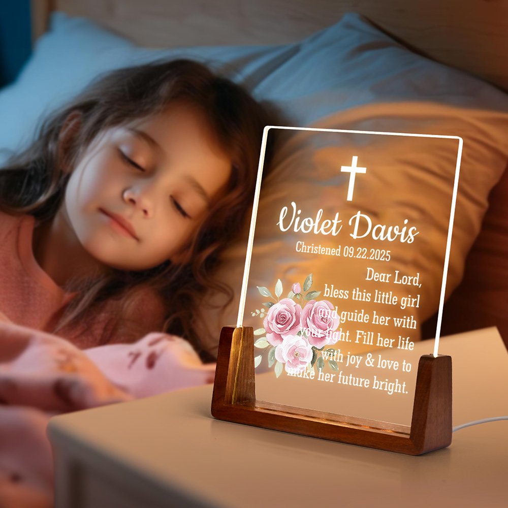 Esta luz nocturna LED presenta un bonito diseño de cruz rodeada de una delicada corona de flores u hojas, que simboliza la fe, el amor y las bendiciones. Puedes personalizarla con un nombre, una fecha y un mensaje para tu hijo para que este regalo sea más único y considerado.