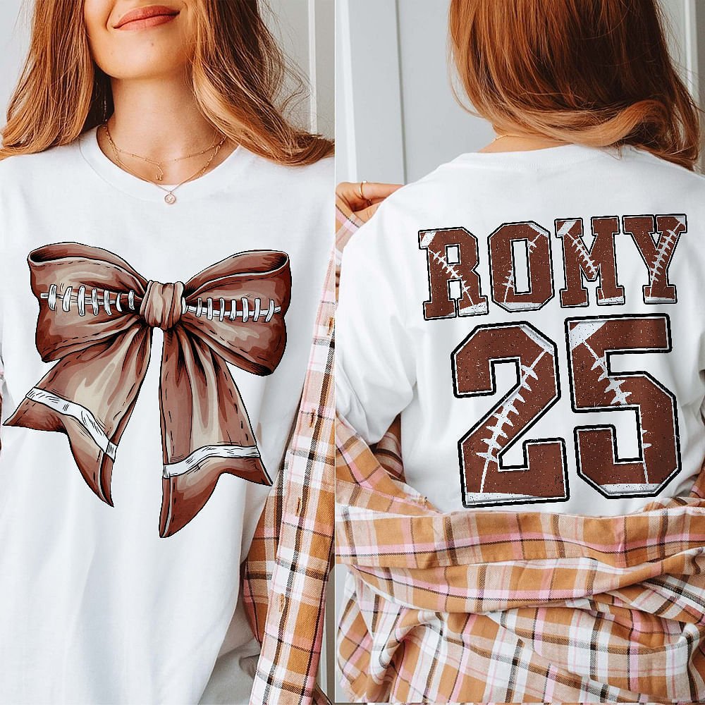 Nuestra prenda es un regalo moderno y único para ella. Presenta un elegante diseño de lazo de coqueta que combina elementos deportivos de moda y fútbol. La ropa se puede personalizar aún más con un nombre y un número, añadiendo un toque especial.