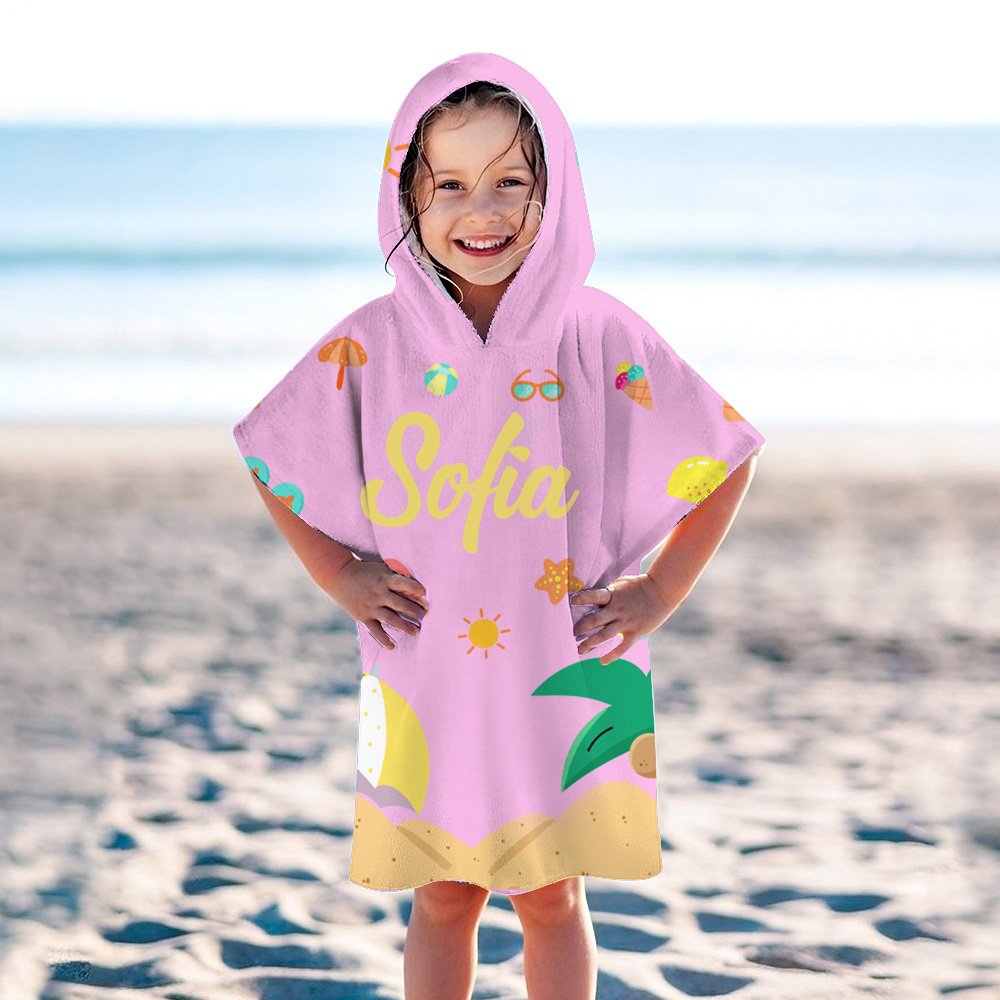 Esta toalla de playa con capucha para niños está inspirada en temas tropicales, playas y el océano. Con colores vibrantes y patrones llenos de vida, agrega diversión infinita al tiempo de juego acuático de tu hijo. Disponible en tres diseños y colores diferentes, puedes personalizarla según las preferencias de tu hijo o hija añadiendo su nombre y creando un producto único y personalizado que refleje su estilo y personalidad.