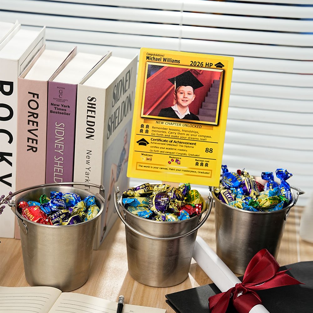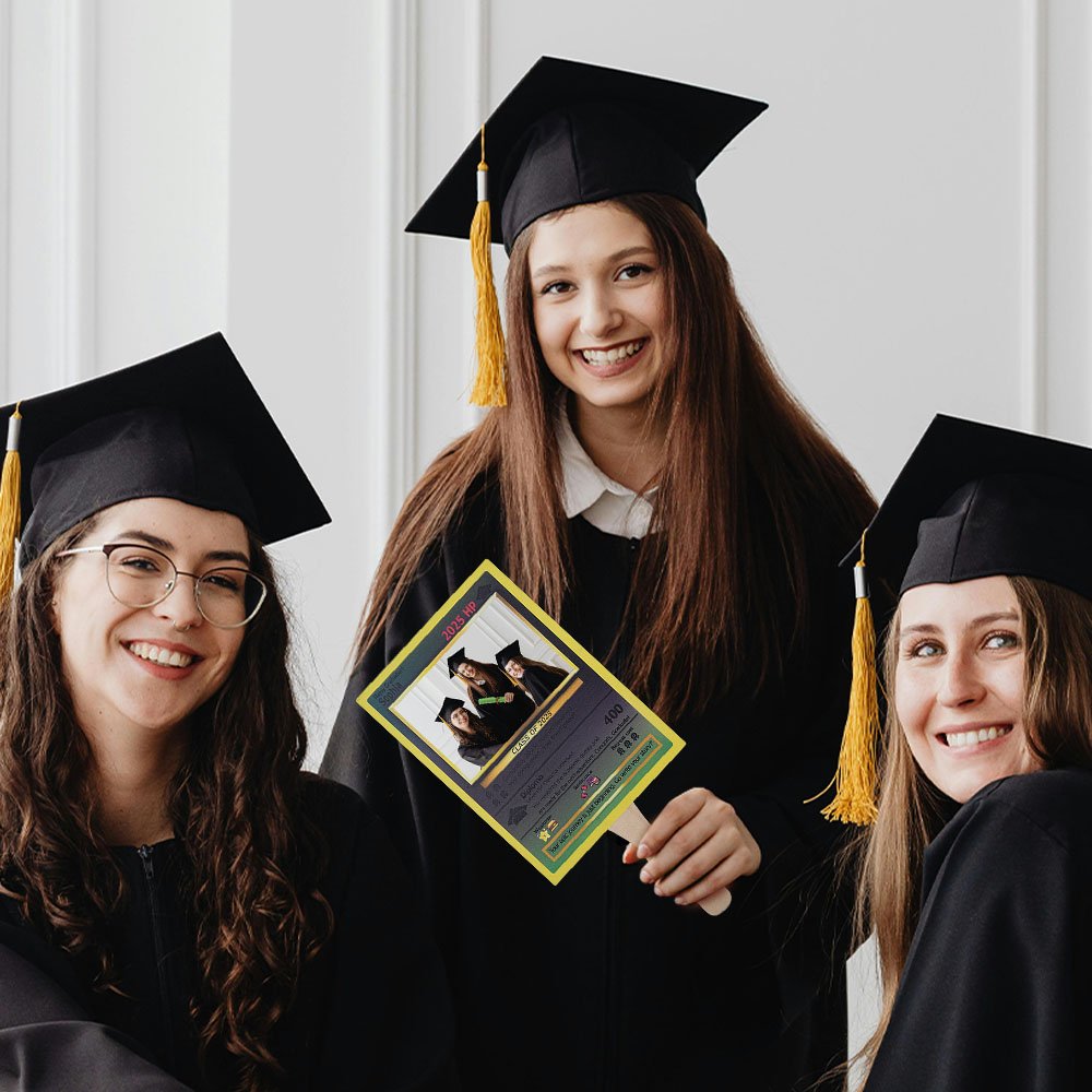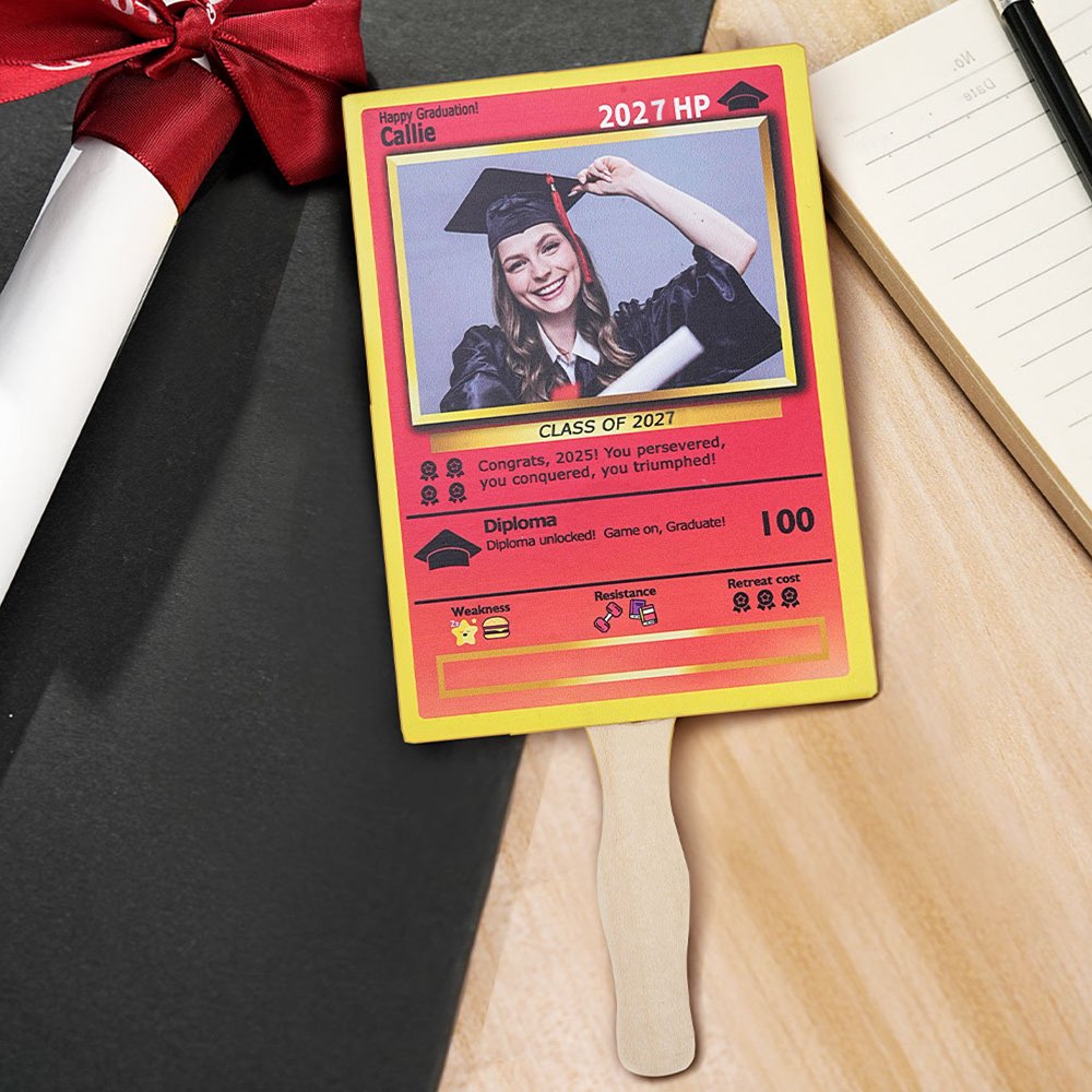 Inspirado en las cartas de juego, este abanico ayuda a los graduados a compartir la alegría de la graduación con familiares y amigos. Presenta diversas opciones de personalización, como un título, el año de graduación, el nombre, la descripción del ataque, etc., que conmemoran los logros de los estudiantes de una forma divertida e innovadora. La foto del graduado puede personalizarse para que destaque entre la multitud.