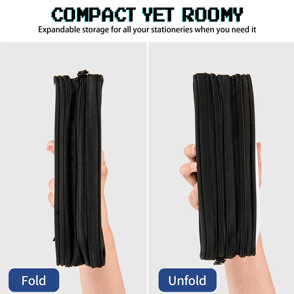 El estuche es grande y de fácil acceso, e incluye 2 bolsillos principales con cremallera y un bolsillo principal sin bolsillo de parche. El otro bolsillo principal tiene 3 bolsillos de parche y 5 ranuras para bolígrafos. Puedes maximizar el almacenamiento de una gran variedad de artículos, desde lápices y bolígrafos hasta rotuladores, gomas de borrar e incluso pequeños aparatos electrónicos.