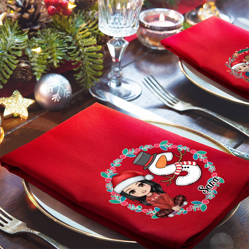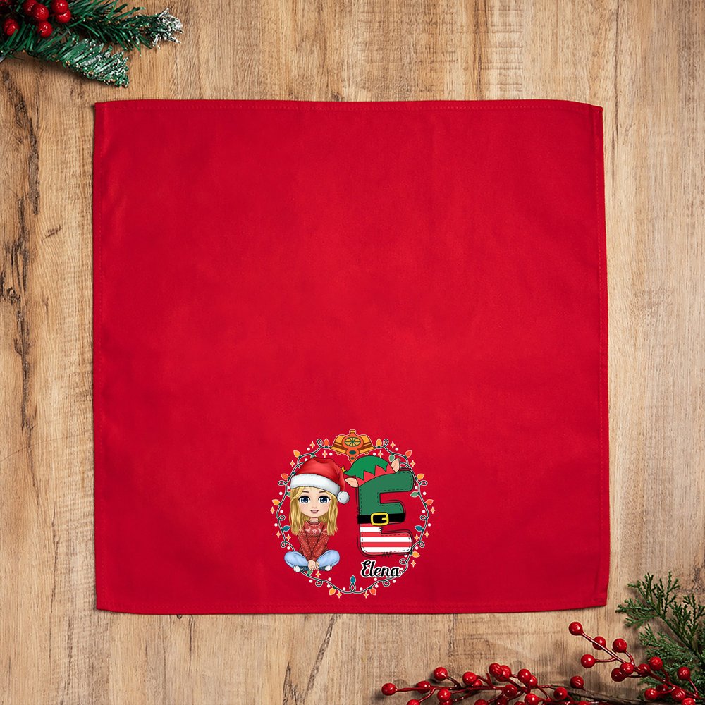 Centrado en torno a personajes de dibujos animados, iniciales y nombres altamente personalizables, este diseño irradia alegría navideña y exclusividad. La base de tela roja complementa el tema navideño, infundiendo a la hora de la comida un ritualismo personalizado a la vez que sirve para fines decorativos y emocionales.