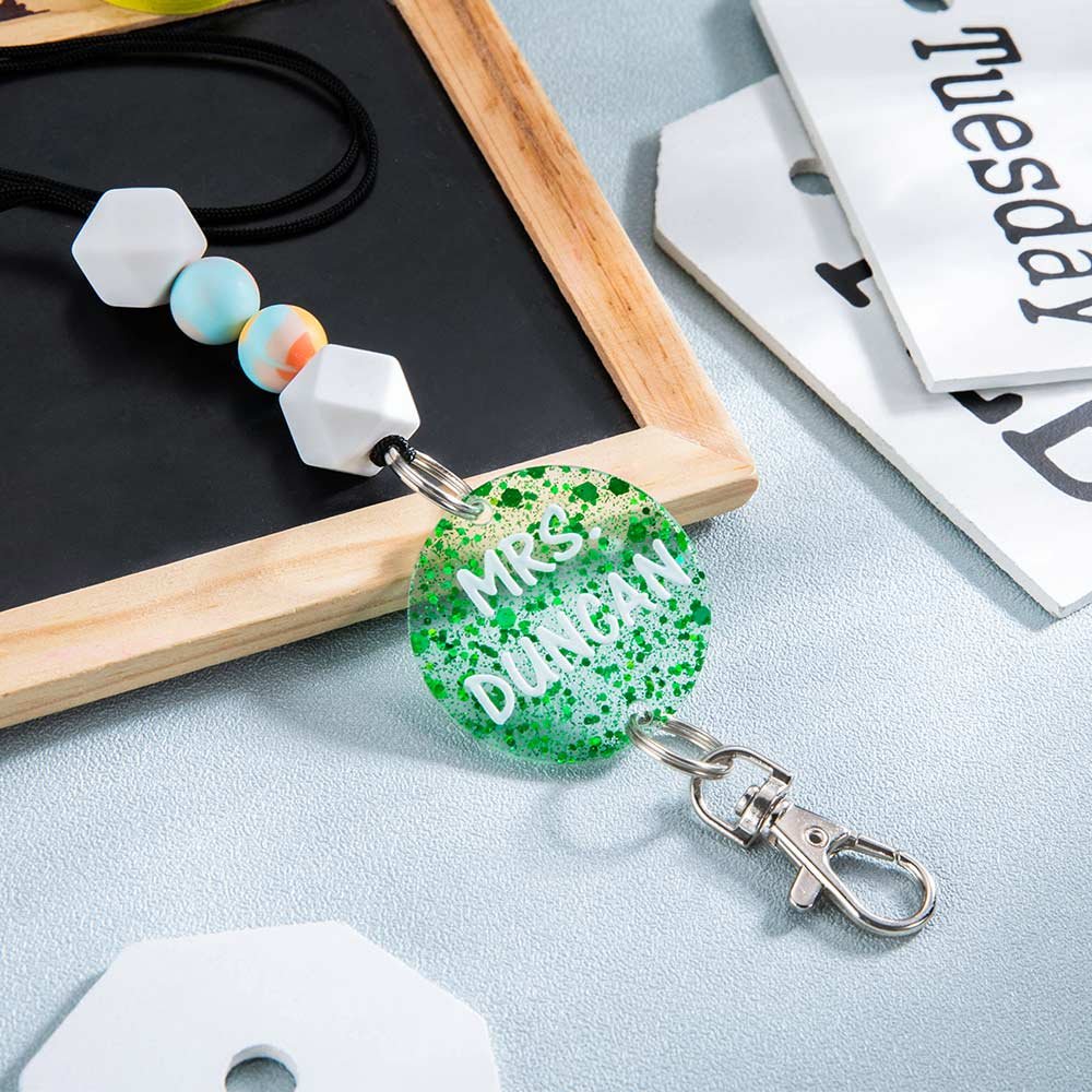 La placa redonda de resina brillante con cuentas hexagonales y redondas de silicona de diferentes colores es un diseño generoso y bonito. La placa redonda de acrílico se puede personalizar con cualquier texto para hacer un cordón de gran aspecto que se puede utilizar para colgar las llaves o ID, o para que coincida con una variedad de estilos de ropa, por lo que es el regalo perfecto para un maestro o cualquier persona que le gusta cordones.