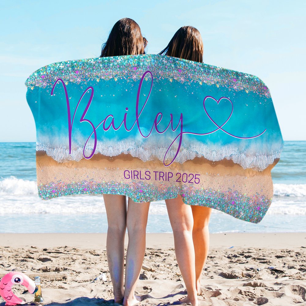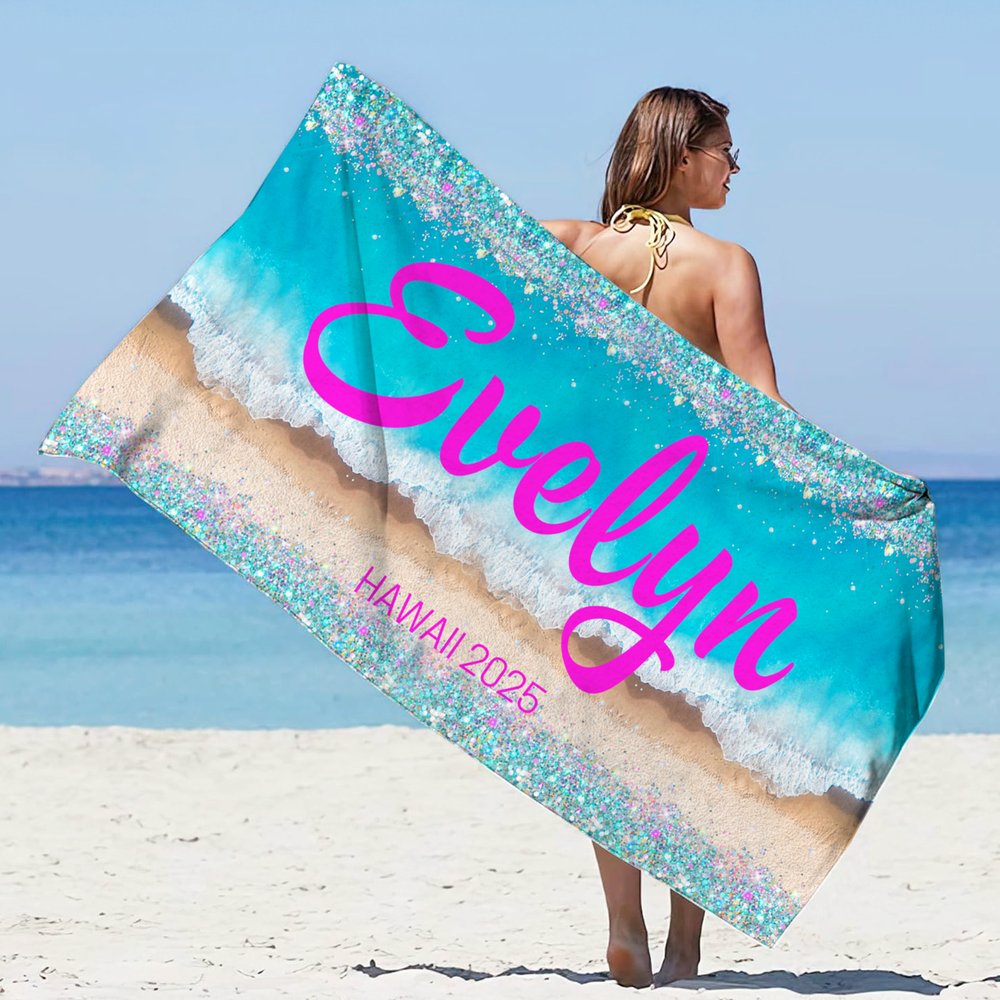 Toalla de playa de gran tamaño y secado rápido con purpurina personalizada con nombre y texto Regalo de vacaciones en la playa y fiesta en la piscina para mujer