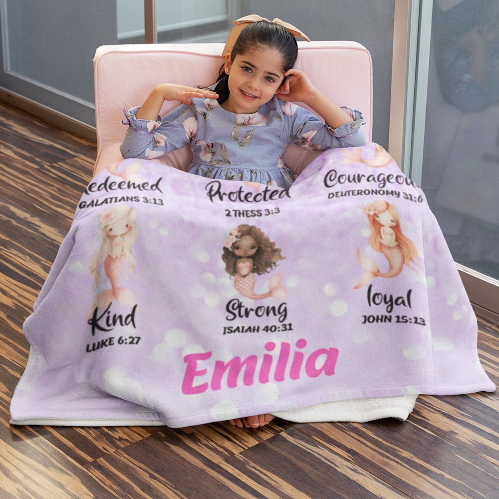Entra en un colorido mundo submarino con esta suave manta. La manta contiene palabras positivas de la Biblia para darte fuerza y apoyo. Las distintas sirenitas son como duendes considerados, que aportan disfrute visual y consuelo espiritual. Puedes personalizar tu nombre o el de tu hijo para crear una relajante arma mágica.