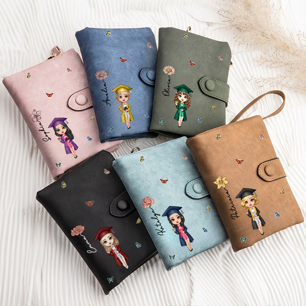 Esta cartera combina a la perfección una impresionante flor de nacimiento, mariposas y simpáticos personajes de dibujos animados de graduados, y también se puede personalizar con el nombre del graduado para crear una cartera única y significativa con la que expresarle su enhorabuena.