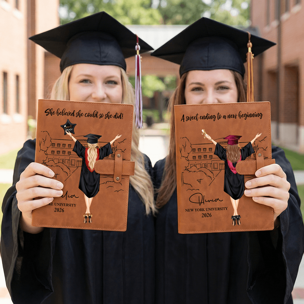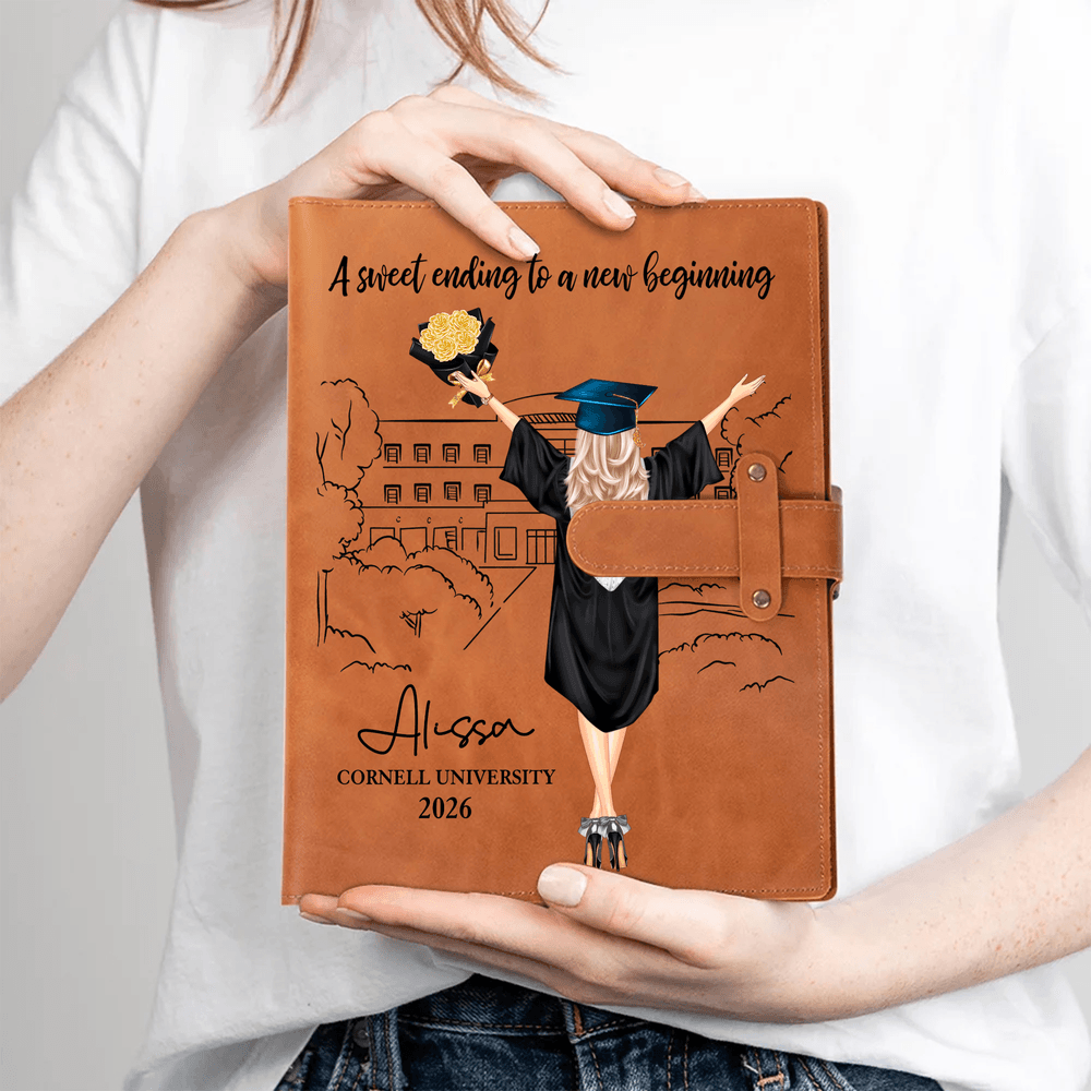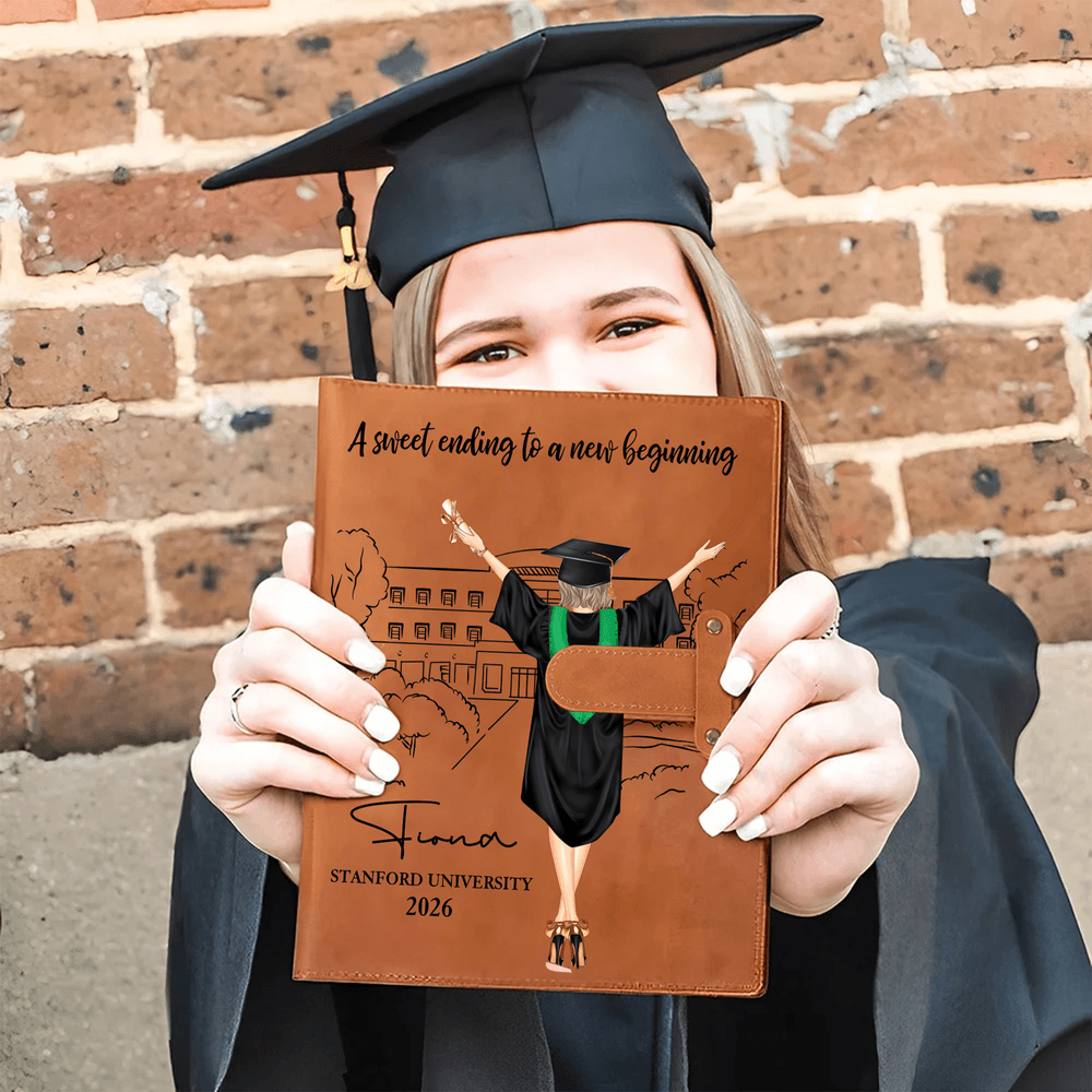 Esta cubierta de cuaderno de cuero PU A5 personalizado cuenta con un impresionante diseño personalizado de personajes de graduación clipart, capturando maravillosamente la alegría y el hito de la graduación. La cubierta está adornada con intrincadas ilustraciones dibujadas a mano de figuras de graduados (aptas para ambos sexos), combinadas con texto personalizable que incluye el nombre, el año de graduación y citas inspiradoras como "Un dulce final para un nuevo comienzo". Es un recuerdo único y artístico que convierte un cuaderno corriente en un recuerdo único de tu trayectoria académica.