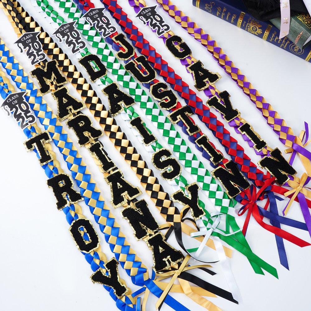 Puedes añadir texto y elegir el año. Además, puedes elegir entre múltiples combinaciones de colores de cintas, para que puedas combinarlas con los tonos del colegio o con tus gustos personales. Así podrás crear un lei único que hará que tu graduación sea aún más especial.