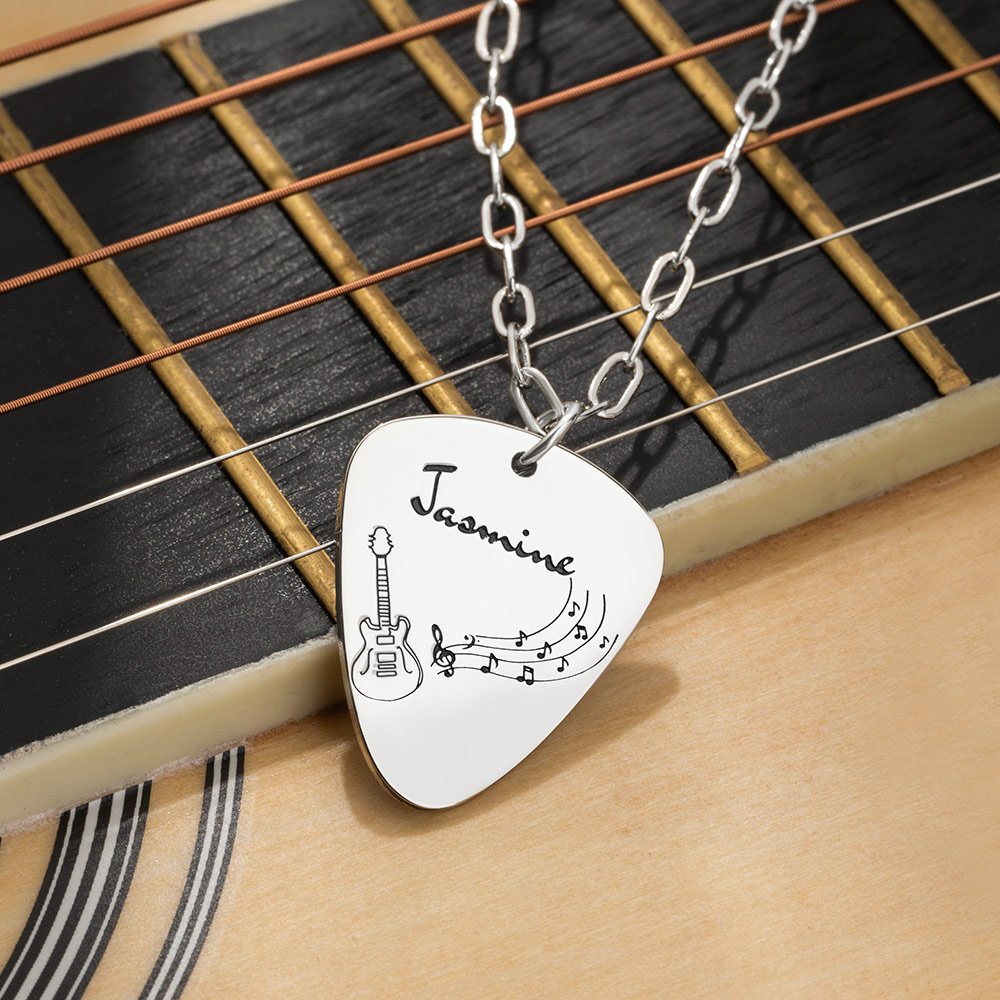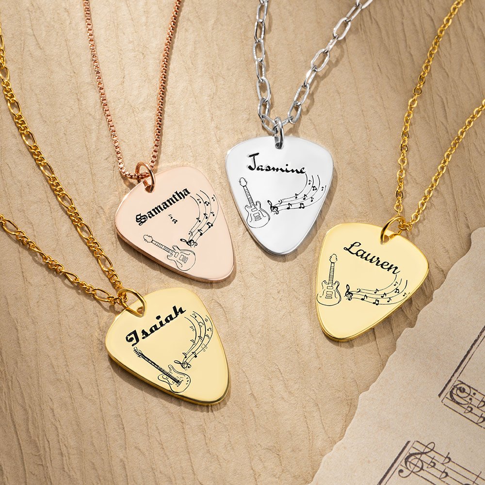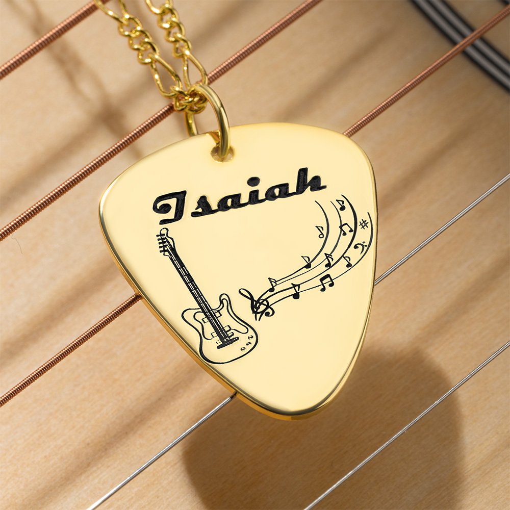 Este collar es un regalo bonito y lleno de significado. El colgante tiene forma de púa de guitarra, con elementos de guitarra y notas musicales diseñados en él. Se combina con un nombre personalizado, que expresa su estilo único y su amor por la música.