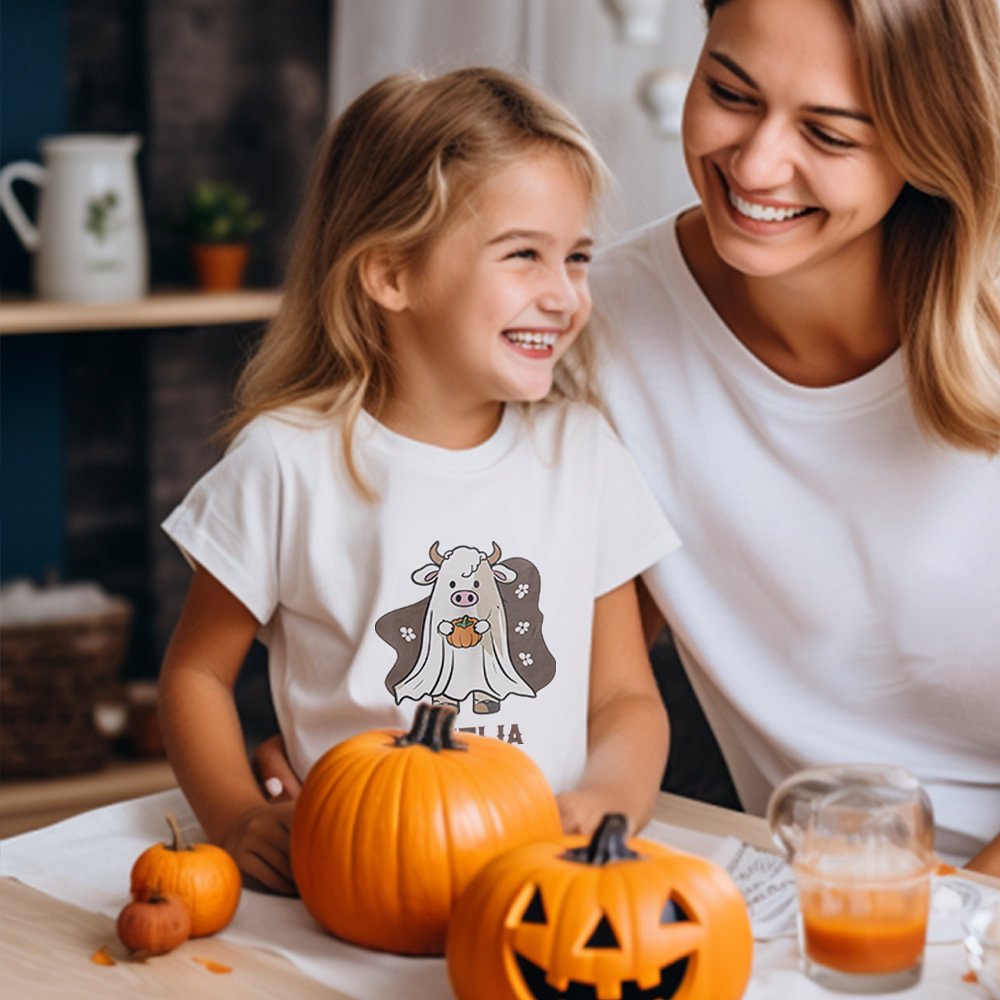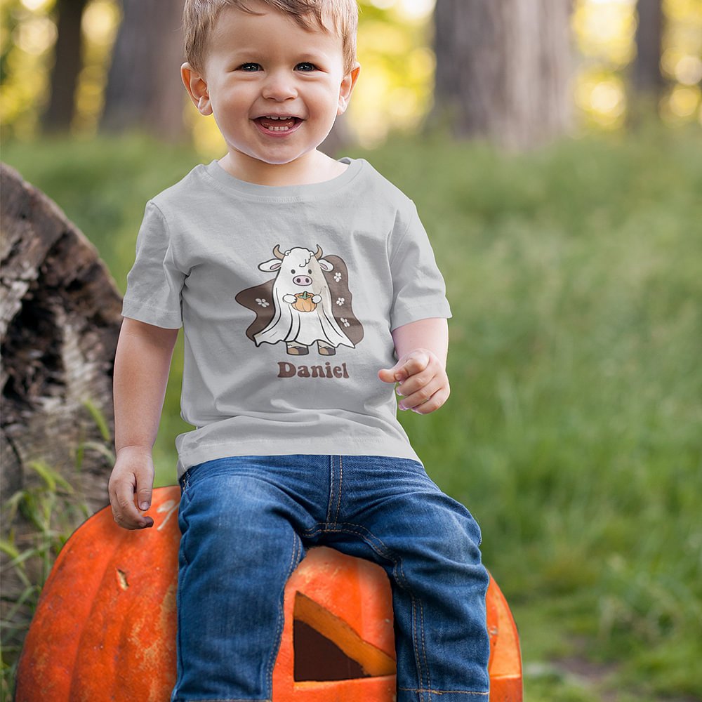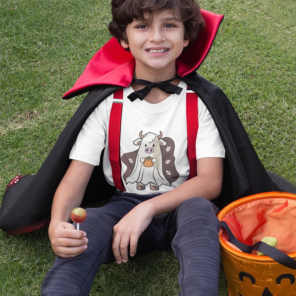 Si tu hijo tiene debilidad por los animales de granja, especialmente las vacas, esta camiseta es imprescindible. Esta camiseta combina dos símbolos icónicos de Halloween - la calabaza y el fantasma - con un toque de vaca caprichosa. Es la camiseta ideal para cualquier joven amante de las vacas, ya que le permite abrazar a su animal favorito en medio de las celebraciones del festival.