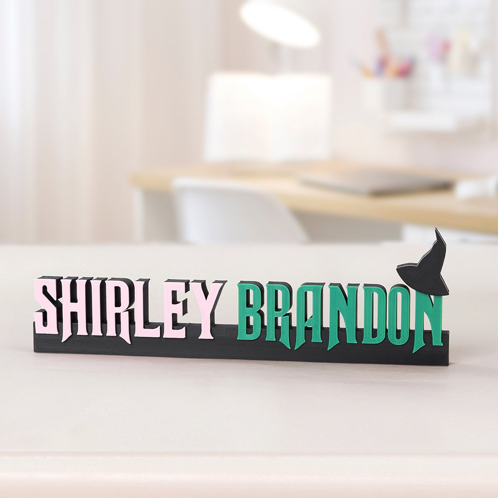 Utiliza nuestra exclusiva placa con nombre impresa en 3D para realzar tu espacio de trabajo con un elegante diseño de bruja malvada. Con estilo de bruja malvada, también puedes elegir entre rosa o verde y personalizar tu nombre, lo que la convierte en el complemento perfecto para realzar la belleza de cualquier espacio.