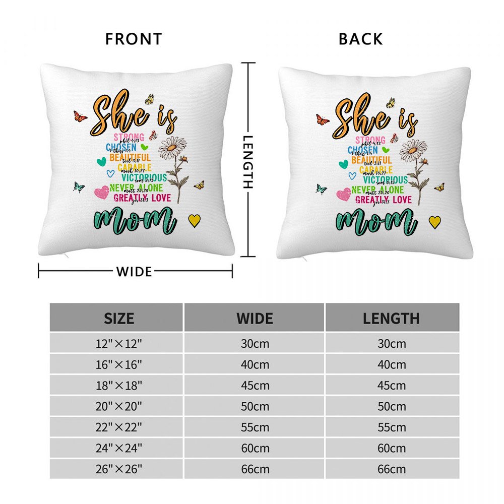 Nuestra funda de almohada presenta coloridas palabras bíblicas edificantes como Ella es "Hermosa", "Fuerte", "Capaz" y "Victoriosa", con delicados motivos de corazones y mariposas. Cada funda de almohada se puede personalizar con una flor de nacimiento y un apodo, creando un accesorio llamativo que refleja su personalidad única.