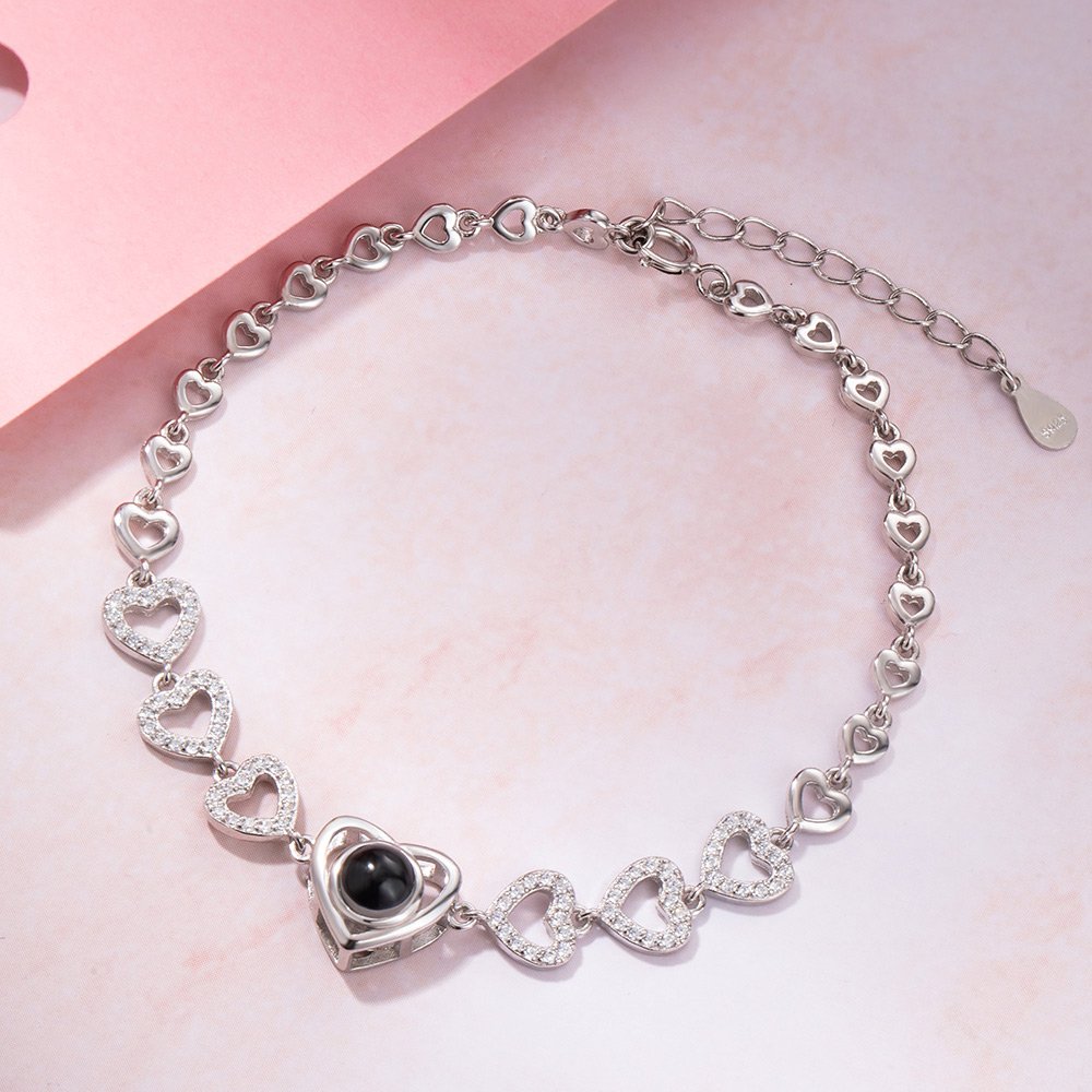 Esta exquisita pulsera presenta múltiples formas de corazón brillantes, todas culminando en un charm de corazón central donde se puede proyectar tu foto personalizada.
