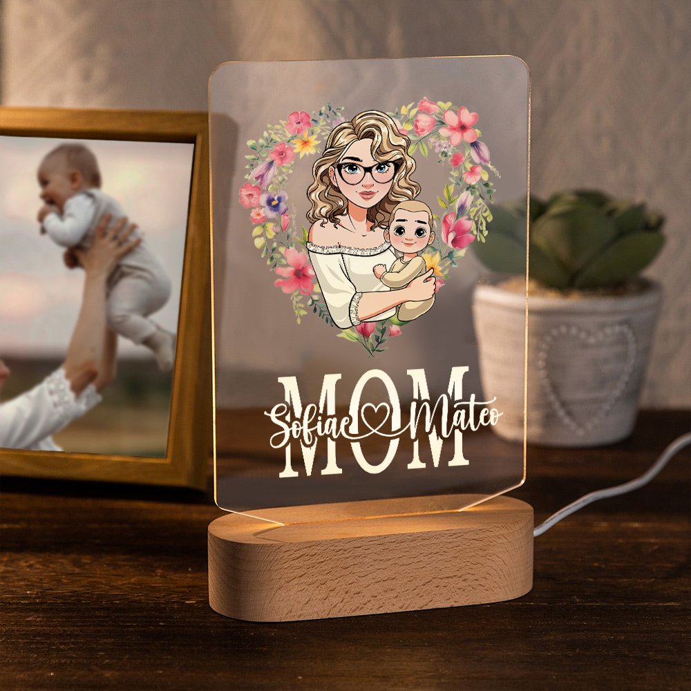 Nuestra luz de noche presenta un diseño con ilustraciones de dibujos animados de una madre y 1 ó 2 niños, lo que le permite personalizar libremente su estilo y atuendo. Además, ofrecemos un servicio de nombres personalizados. Los nombres que proporcione para la madre y el niño estarán conectados por un símbolo de corazón, complementado por una corona de flores en forma de corazón detrás de los personajes. Este diseño expresa plenamente el profundo vínculo entre una madre y su hijo.