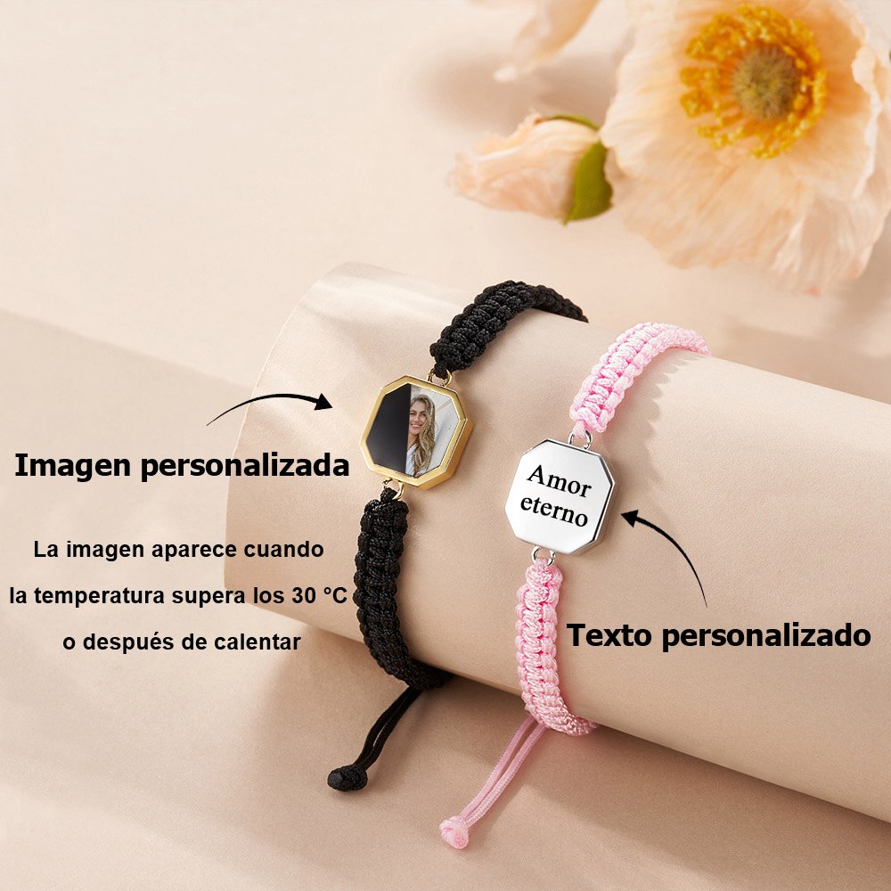 Nuestra pulsera cuenta con una tecnología fotográfica activada por temperatura. A temperatura ambiente, el colgante parece una joya normal, pero al tocarlo, se calienta gradualmente. Una vez que la temperatura supera los 30 °C, sucede algo mágico: ¡la foto que hayas subido aparece en la joya, brindándote una sorpresa hermosa y emotiva!