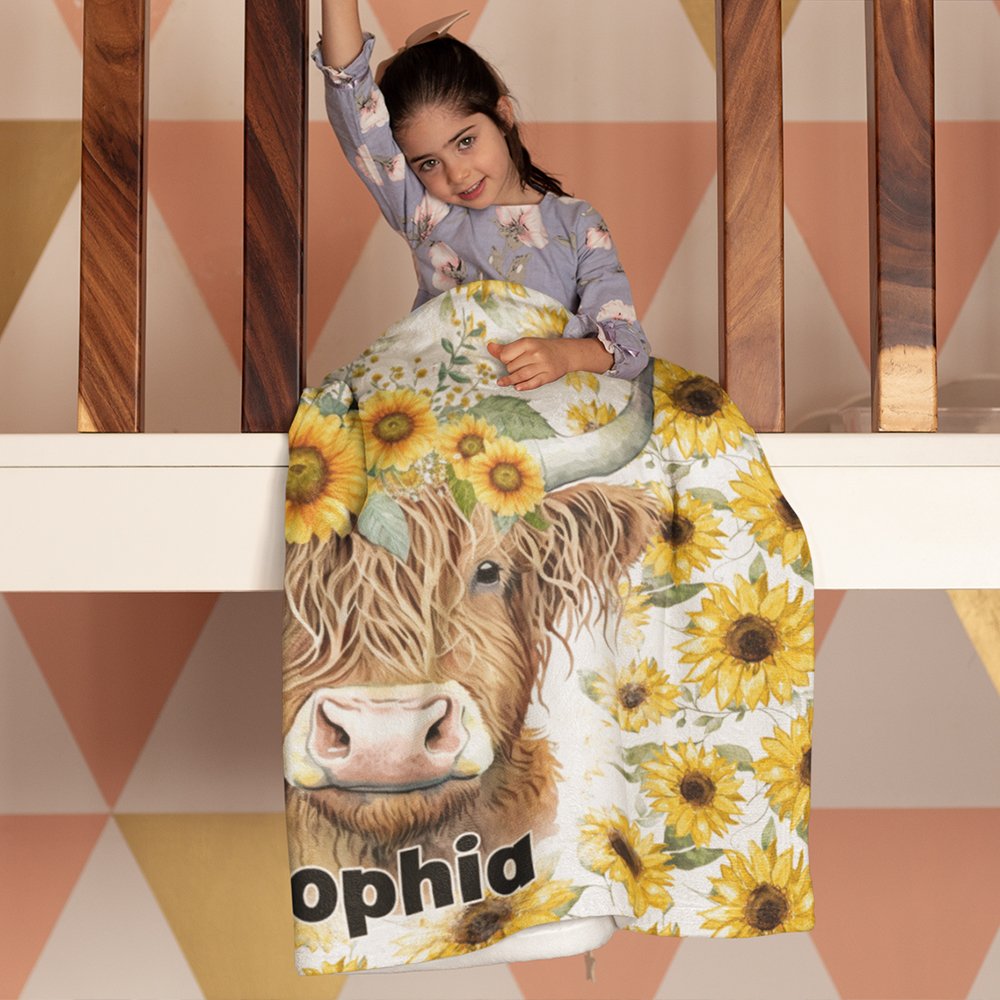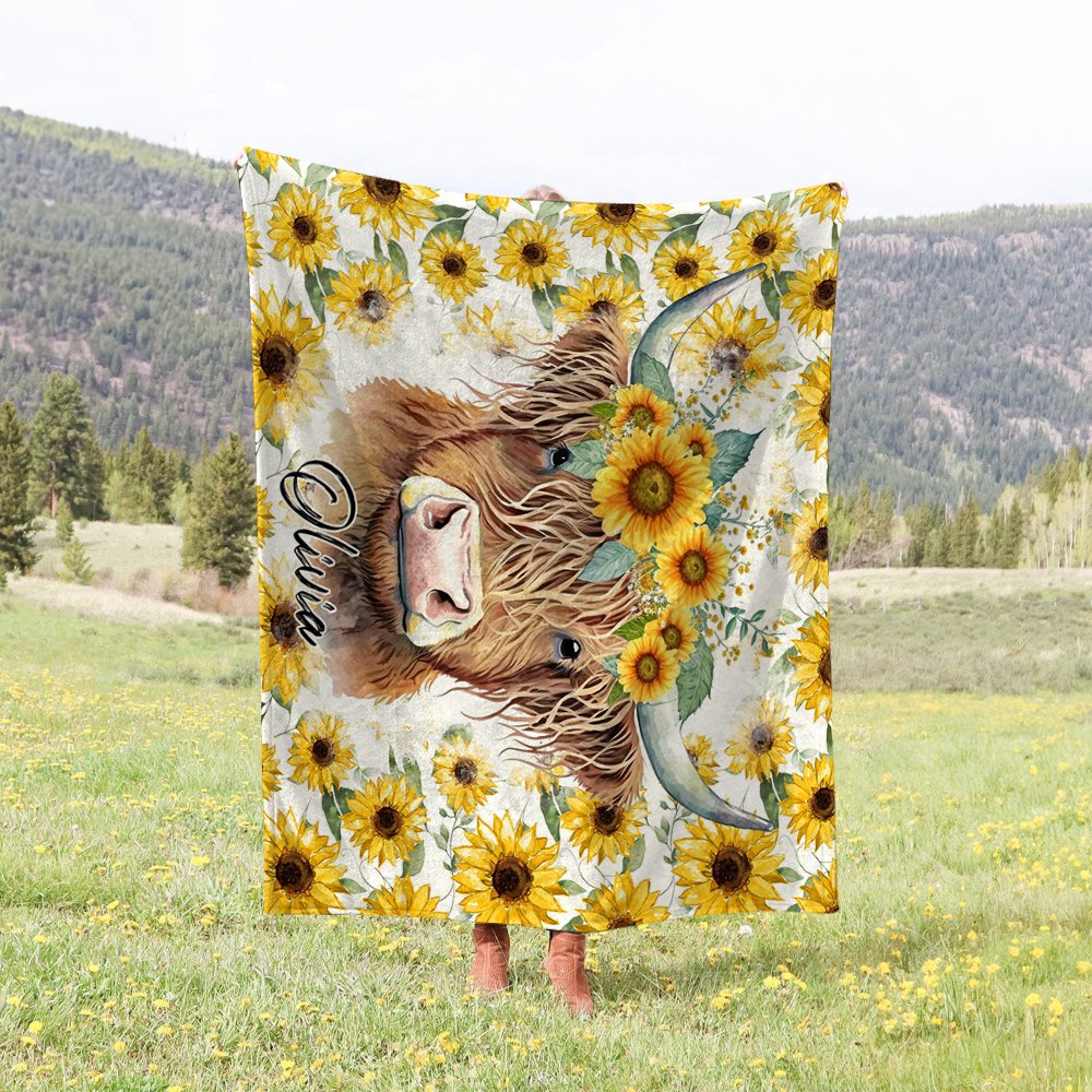 Esta manta de franela de vaca de las tierras altas personalizada es un regalo realmente único. Con la opción de añadir un nombre, se convierte en un recuerdo especial que será atesorado durante años. El adorable diseño de vaca montañesa y girasol añade un toque de ternura y calidez a la decoración de cualquier habitación infantil o dormitorio.