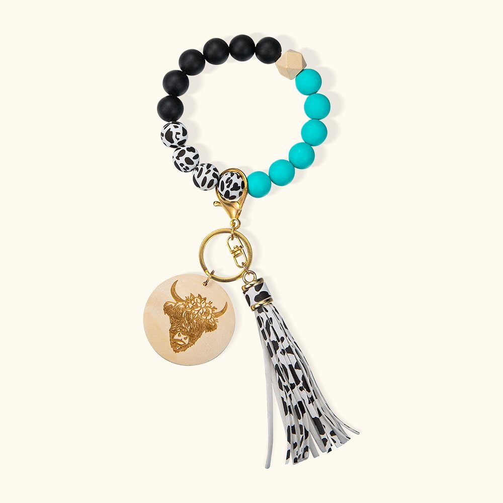 Este llavero pulsera presenta un bonito diseño bohemio con estampado de vaca, que combina moda y practicidad. La pulsera está hecha con cuentas de silicona y cuerda elástica, y se completa con un cierre de langosta y un llavero con borla a juego. La anilla metálica y el cierre de langosta no se desprenderán fácilmente y mantendrán su brillo durante mucho tiempo.