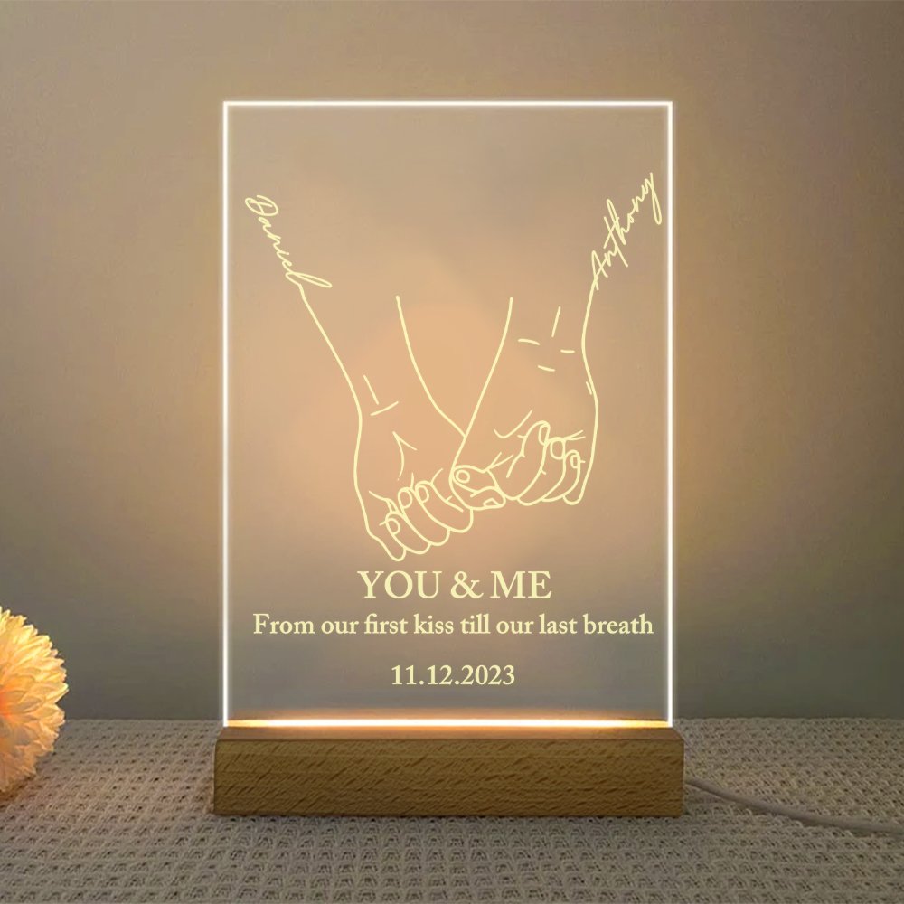 Esta placa acrílica presenta un conmovedor diseño de dos manos que se abrazan con fuerza, simbolizando el vínculo y el afecto entre dos personas profundamente enamoradas. La vibrante luz nocturna LED arco iris crea un ambiente mágico, proyectando un hermoso espectro de colores que irradian calidez y amor.