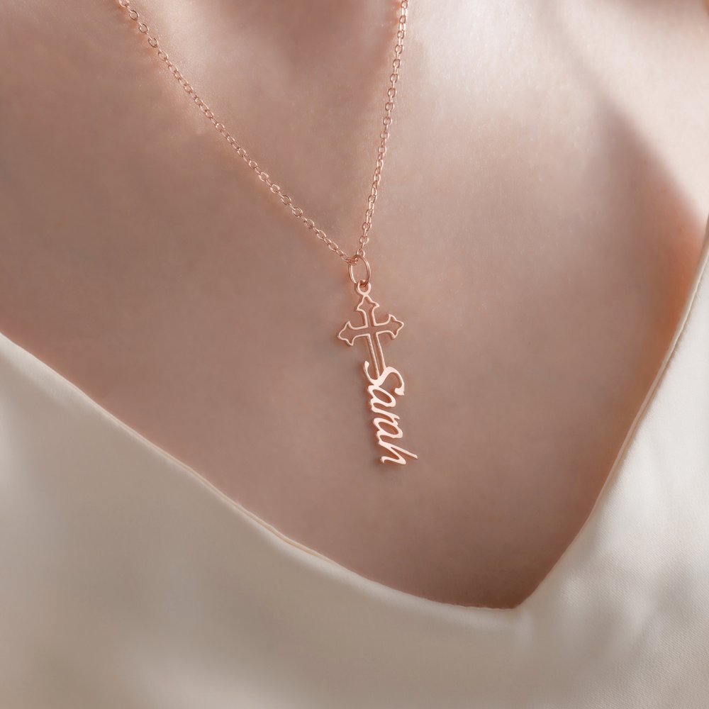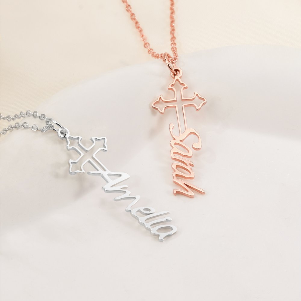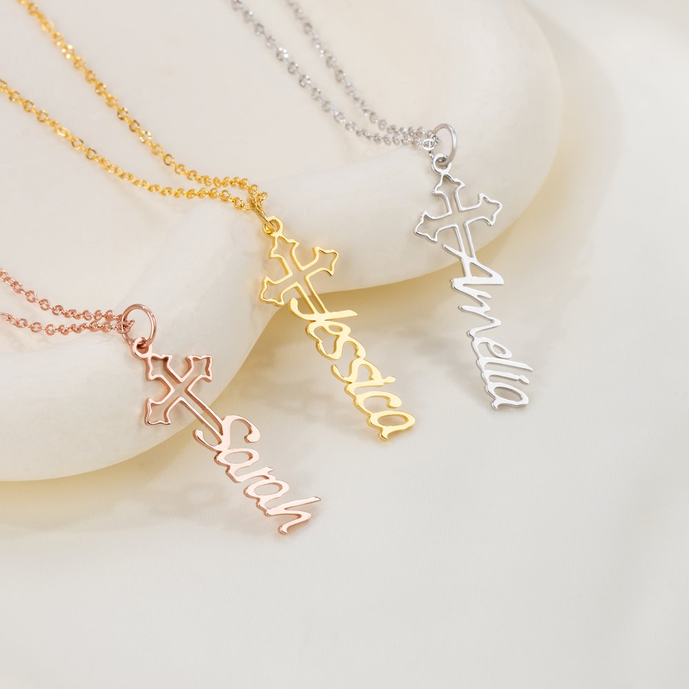 Elaborado en plata de ley y latón, este collar garantiza que cada detalle esté meticulosamente pulido. Ya sea el colgante en forma de cruz o el nombre, el corte de precisión y el acabado brillante muestran una artesanía y una durabilidad excepcionales. Esta pieza no sólo luce hermosa, sino que mantiene su brillo y encanto con el uso diario.