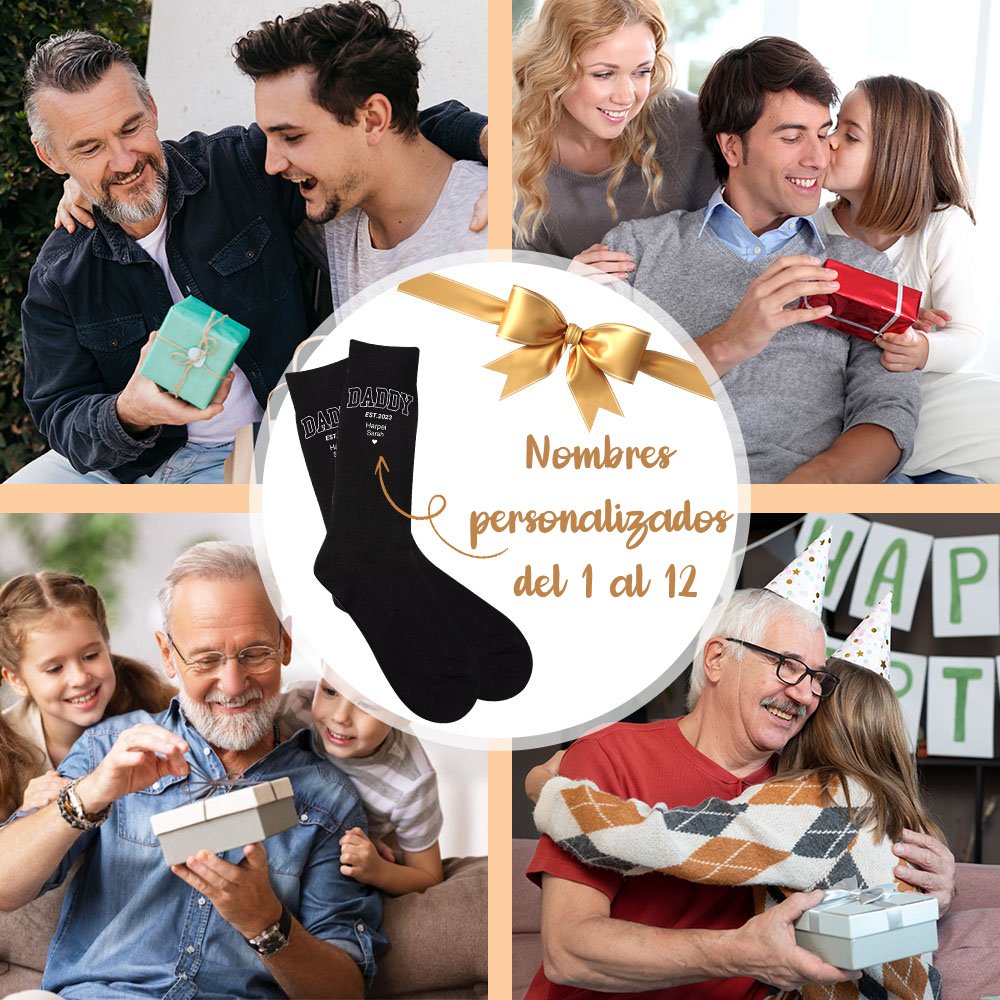 Este par único de calcetines es una manera especial de mostrar tu amor y gratitud hacia tu familia, como tu padre, esposo o abuelo. Los calcetines también se pueden personalizar con los nombres de 1 a 12 niños y miembros de la familia para hacerlos aún más especiales.