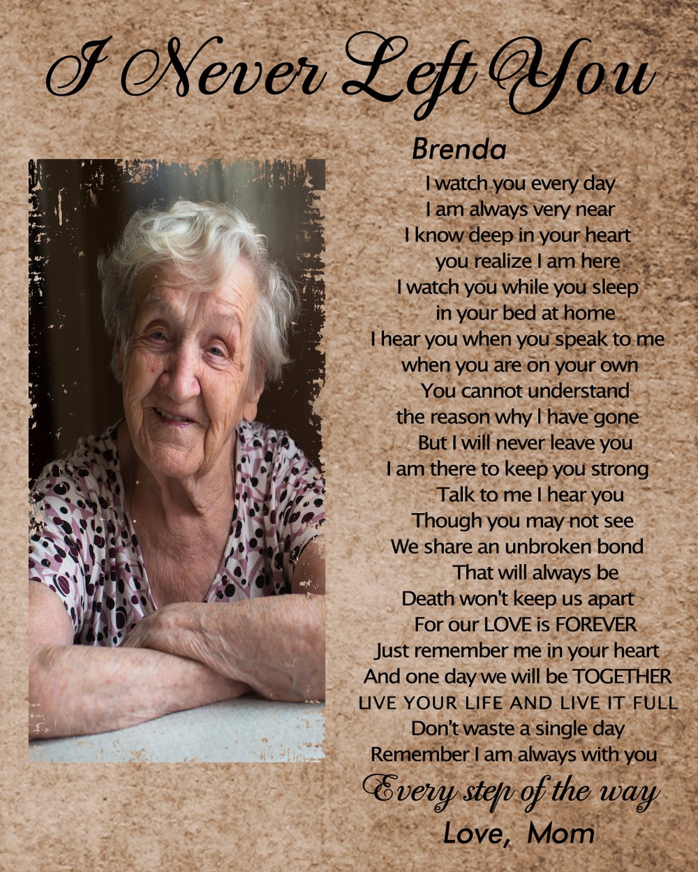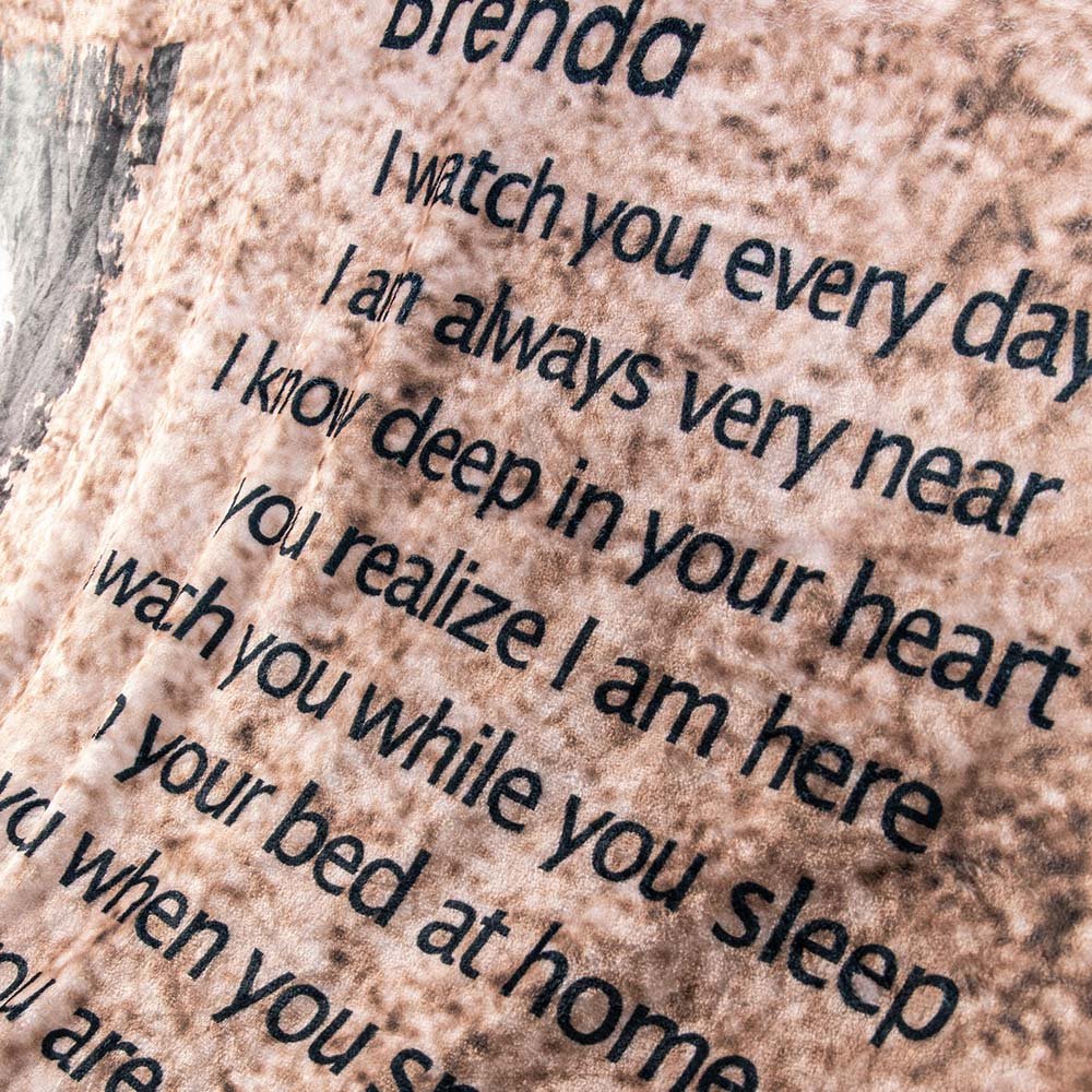 La manta personalizada con foto "Nunca te dejé" es un sentido abrazo de recuerdos y amor. Es como un cálido abrazo de tu ser querido que te envuelve. Puedes personalizarla con una foto y nombres, manteniendo vivos vuestros recuerdos más preciados. Es una forma única y sincera de honrar y recordar a quienes echas profundamente de menos.