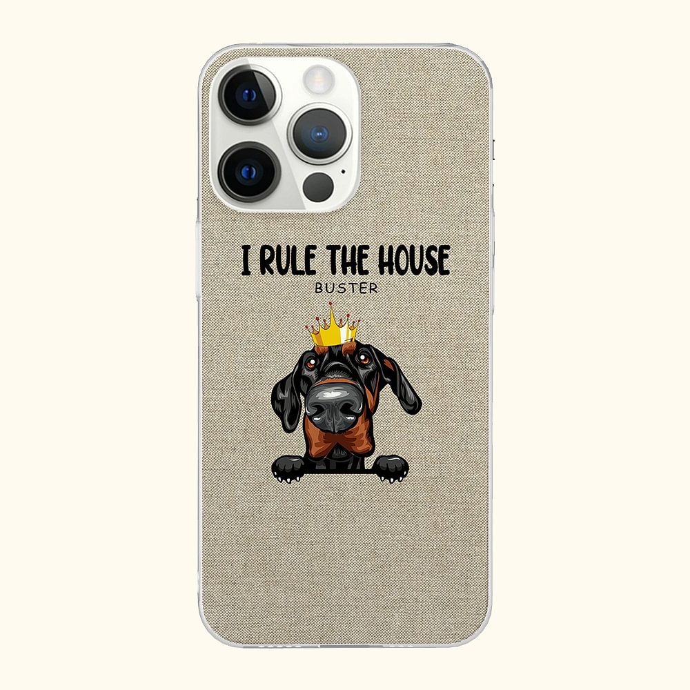 Nuestras fundas para móvil presentan un tema de mascotas con una simpática mascota con corona en el centro de un fondo marrón claro con el lema "Yo/nosotros mandamos en casa" para que la imagen sea ingeniosa y divertida. Puede elegir el número y la raza de las mascotas, así como añadir sus nombres para convertirlo en un regalo único y atento.