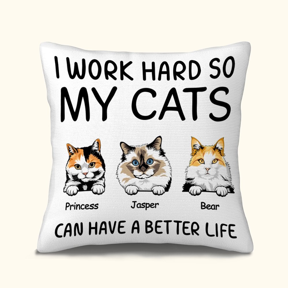 La funda de almohada imprime las palabras "I WORK HARD SO MY CATS CAN HAVE A BETTER LIFE" para expresar el amor por los gatos, y se puede personalizar con razas y nombres de gatos para formar una única para atraer a los amantes de los gatos que aman la decoración del hogar juguetona y caprichosa.