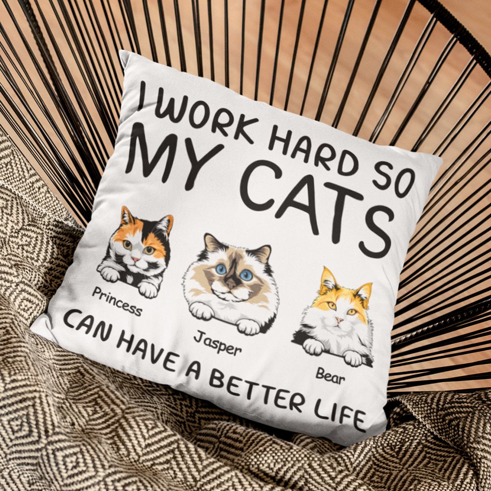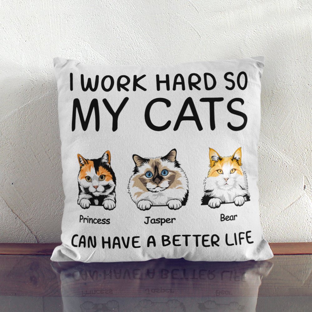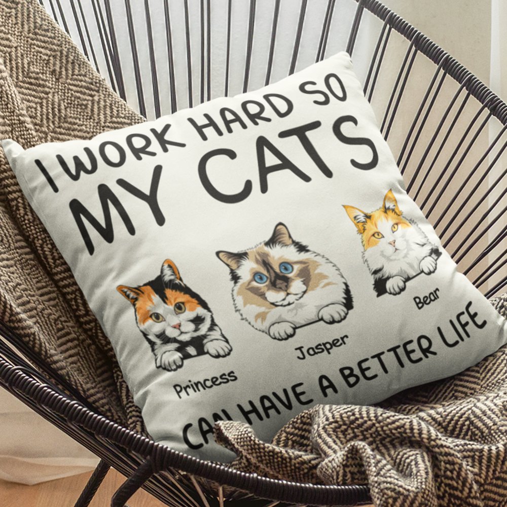 La funda de almohada imprime las palabras "I WORK HARD SO MY CATS CAN HAVE A BETTER LIFE" para expresar el amor por los gatos, y se puede personalizar con razas y nombres de gatos para formar una única para atraer a los amantes de los gatos que aman la decoración del hogar juguetona y caprichosa.